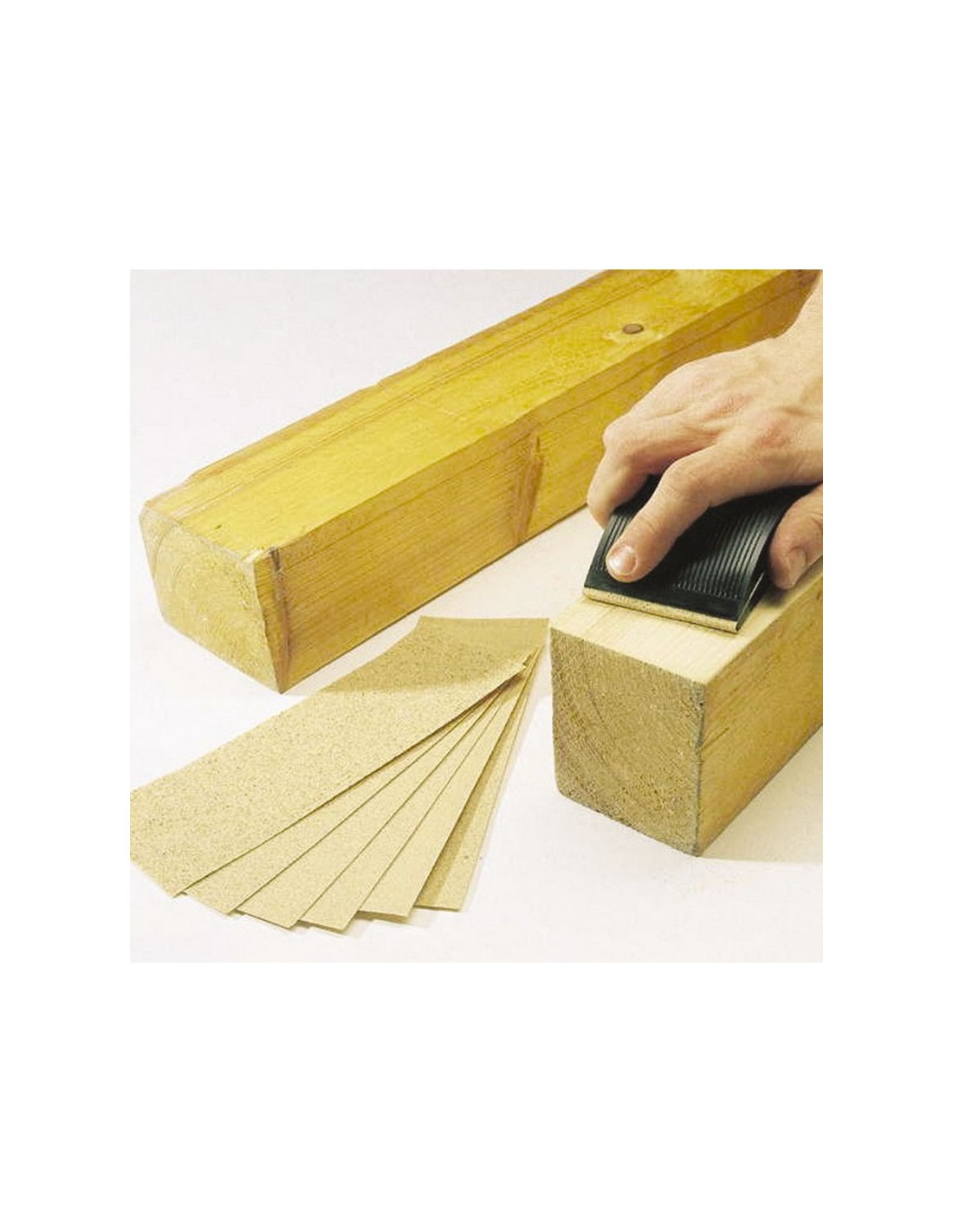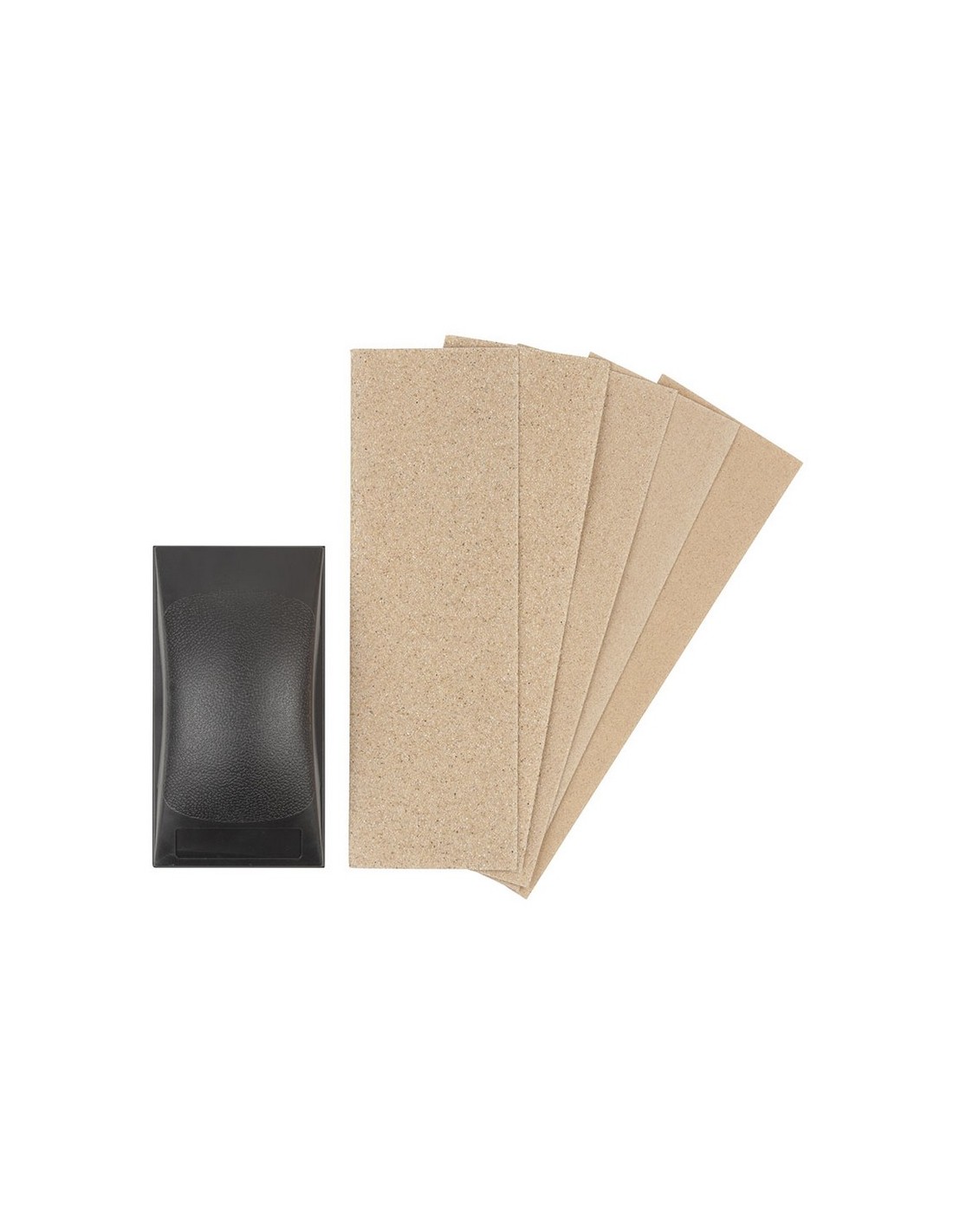 Juego lijado manual WOLFCRAFT Plástico. Para la limpieza de superficies delicadas. 1 taco de lijar manual de plástico de 130x70 mm. 50 hojas de lijar de 70x210 mm (10 papeles de cada grano: 40/60/80/100/120). 51 piezas.