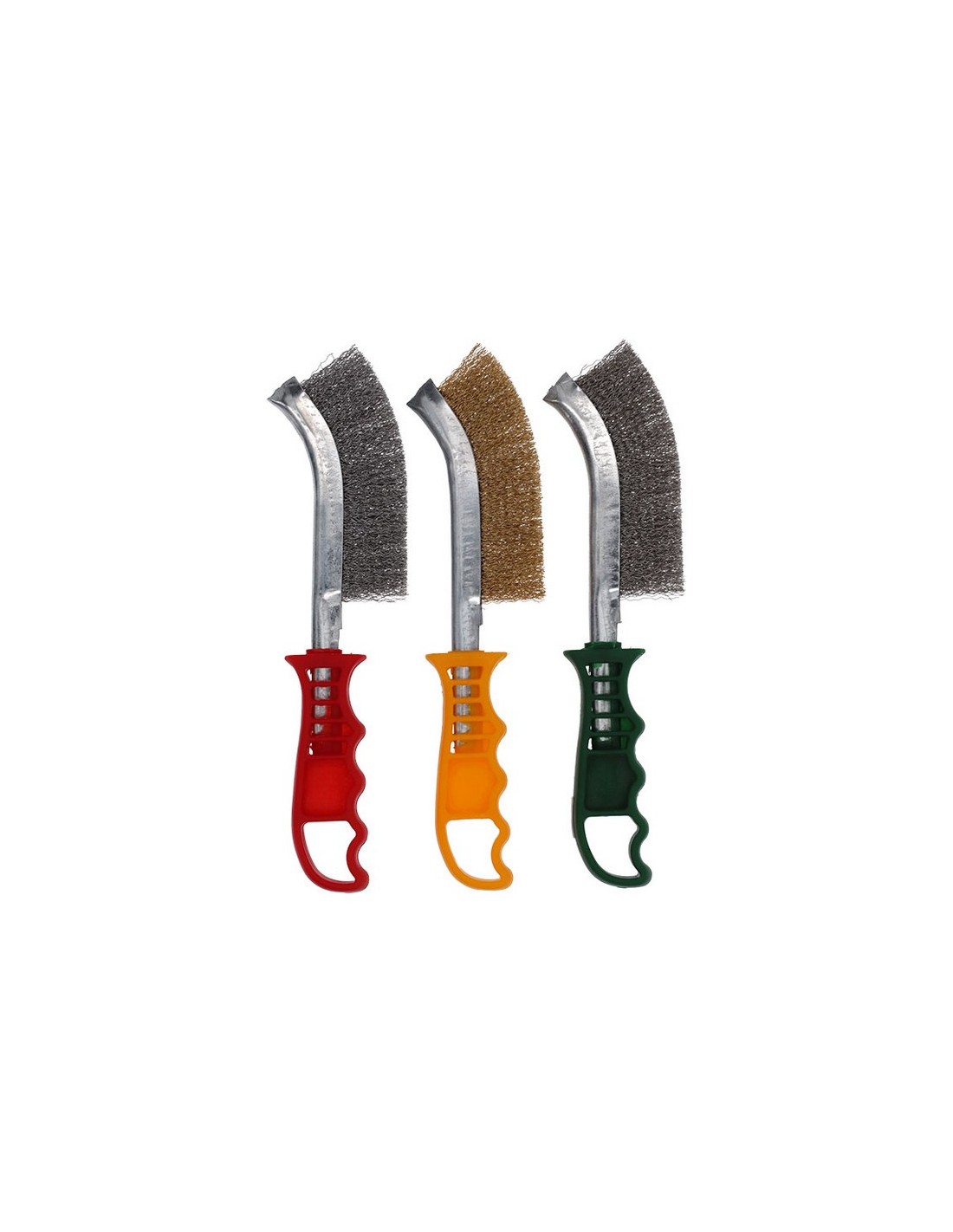 Cepillo púas NORTON Expert Juego 3 cepillos: Mango rojo de alambre de acero, mango verde de alambre de acero inoxidable y mango amarillo de alambre latonado. Ideal para decapado y limpieza de metal y madera (pintura y suciedad de cualquier superficie). Juego 3 cepillos.