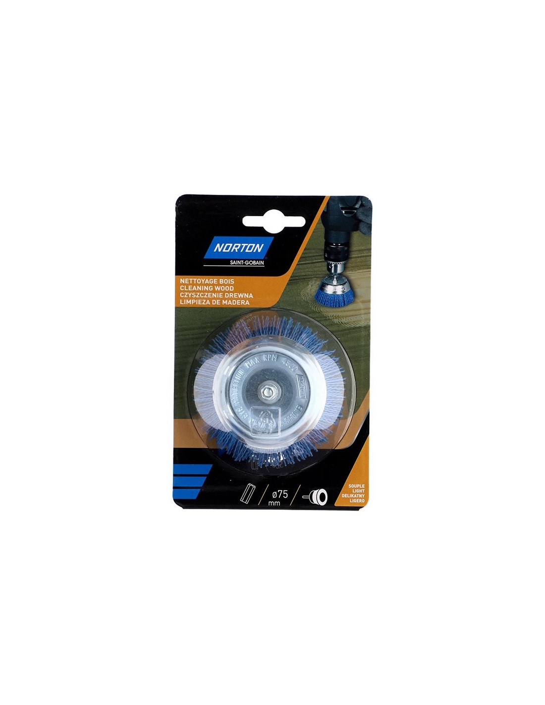 Cepillo abrasivo copa para taladro NORTON Expert Nilón/corindón. Eje hexagonal de 6 mm para todo tipo de taladro. ø 75 mm. Azul. Fino.