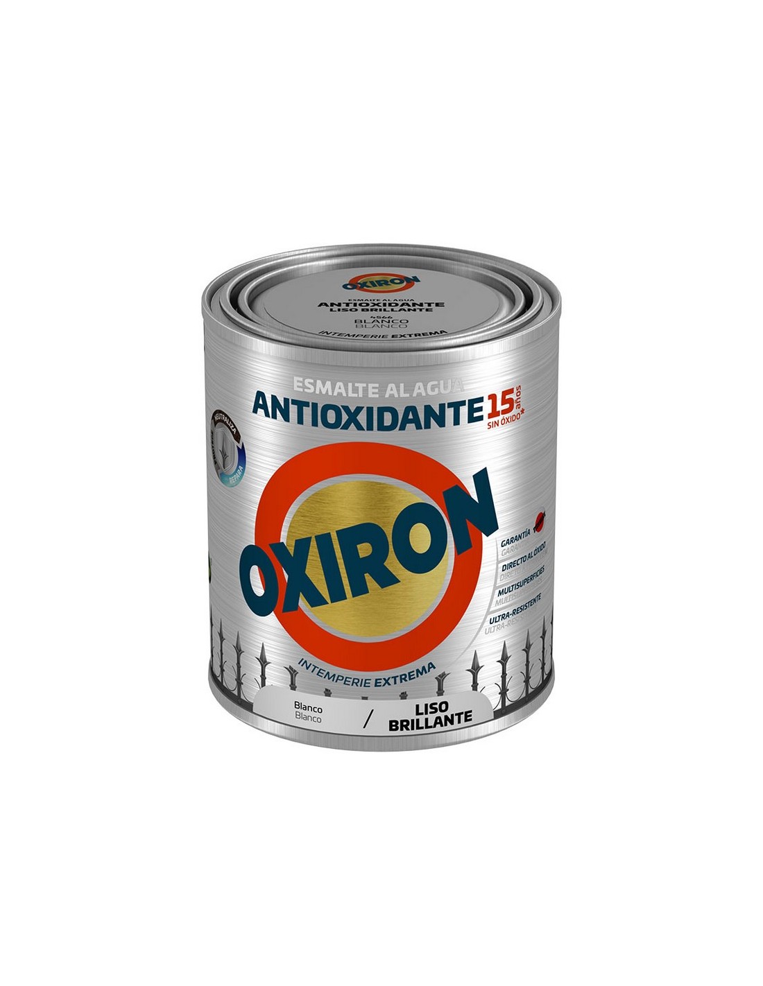 Esmalte antioxidante al agua OXIRON Liso Multiadherente mate al agua para metal. Secado rápido. Rendimiento de 8 a 12 m2. Sin olor. Aplicación directa sobre acero, aluminio y galvanizado. 750 ml. Blanco. Brillante. 750 ml.