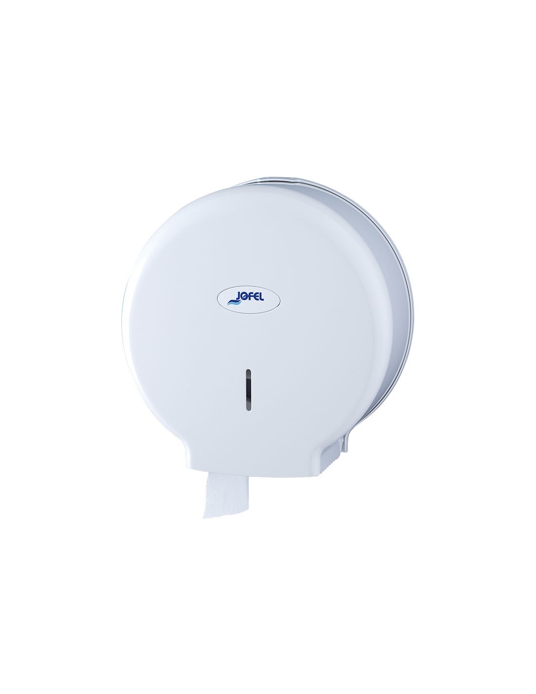 Portarrollo mediano JOFEL Smart. Cerradura con llave y visor de control de carga. Admite rollos de hasta 300 m con diámetro máximo de 220 mm. Válido para rollos con mandril de ø 45 mm. Apertura batiente frontal. Indicado para colectividades y WC públicos de media/alta rotación. Fáci ABS blanco.