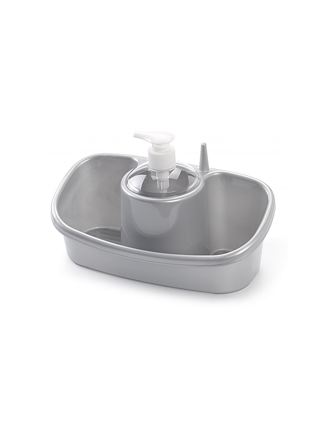 Portaestropajo con dosificador jabón Plástico gris. 2 compartimentos y un portaanillos. 26x13xh.16,5 cm.