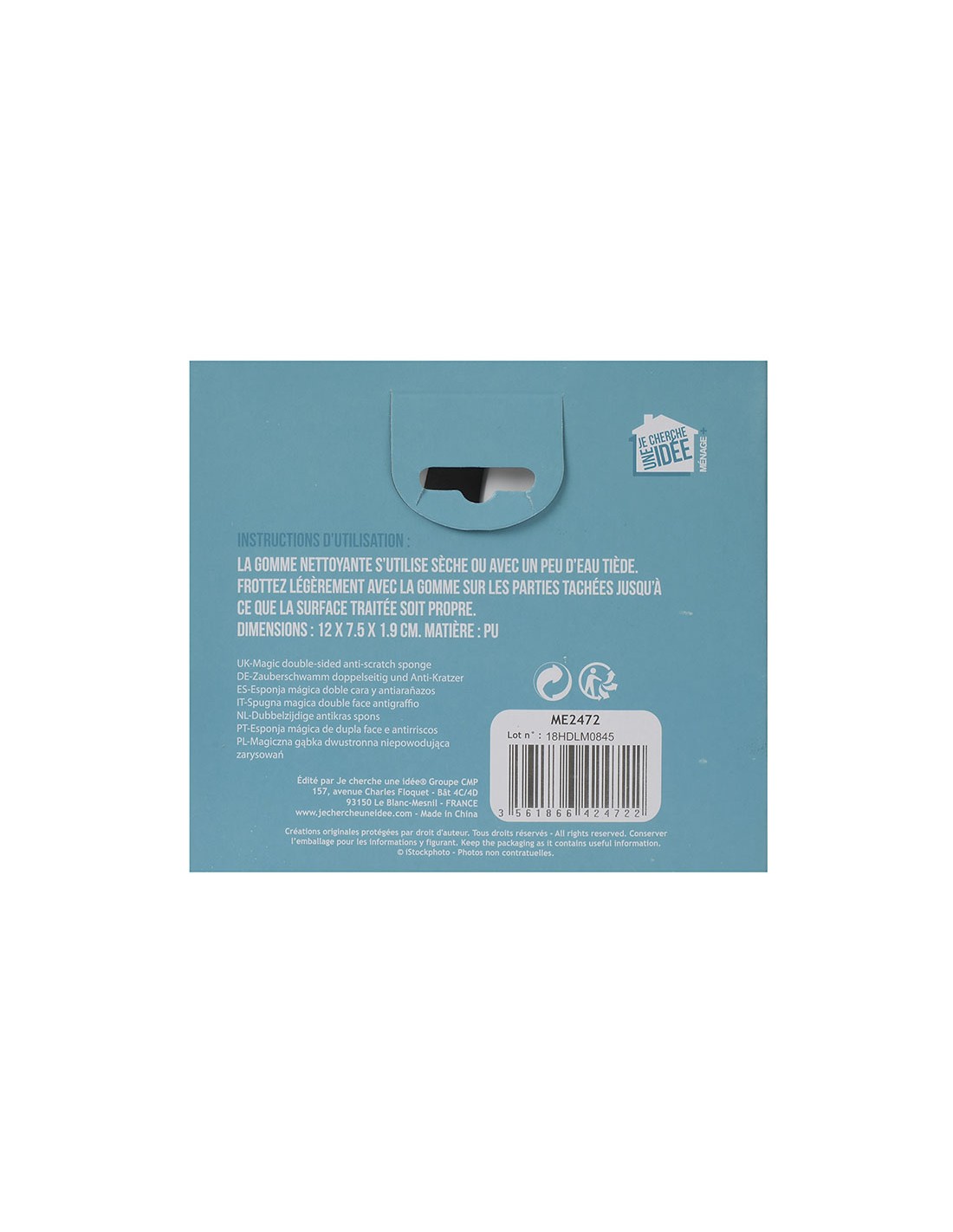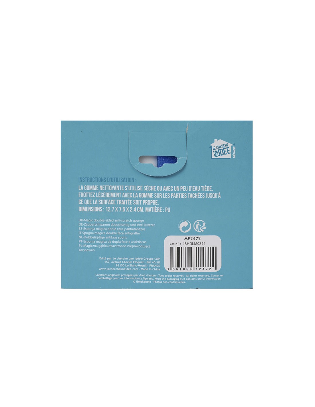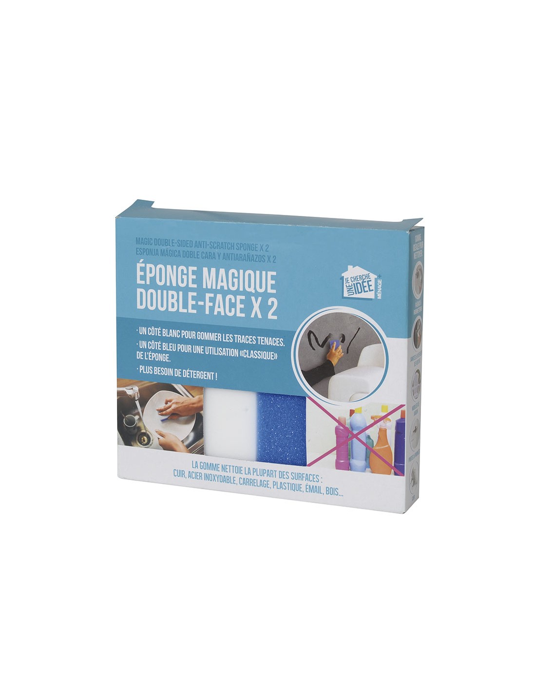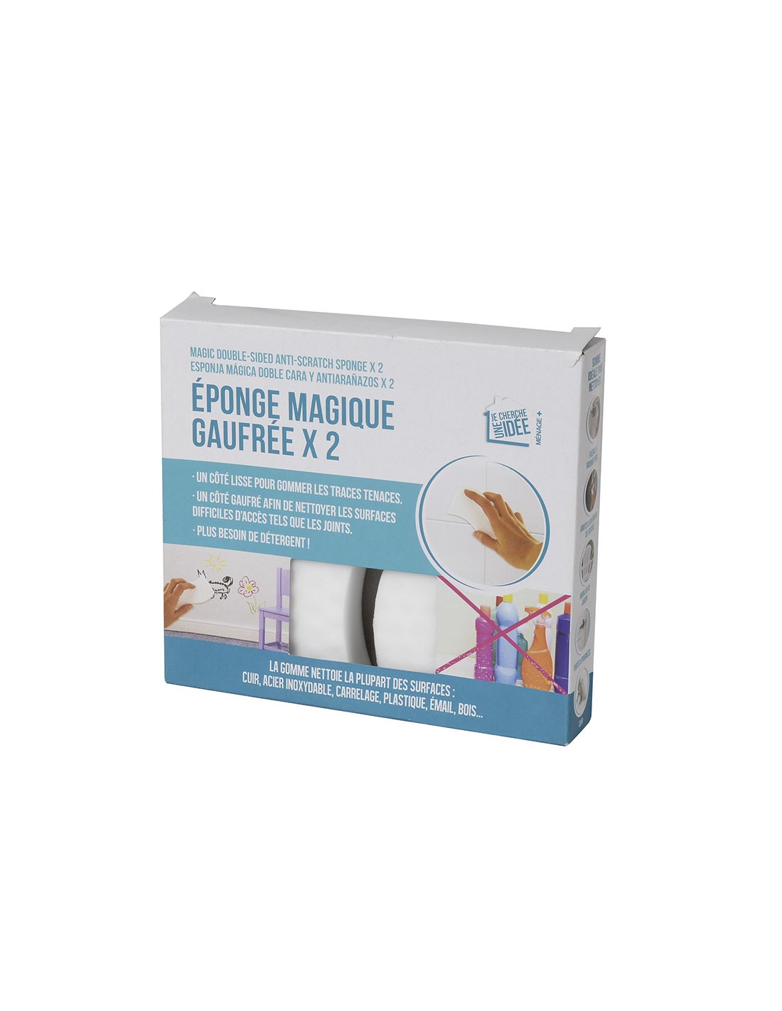 Esponja mágica para limpieza. Doble cara, blanco/azul. La cara lisa elimina huellas y manchas, la cara con relieve permite limpiar las superficies con difícil acceso como las juntas de los azulejos. Pack 2 unid.