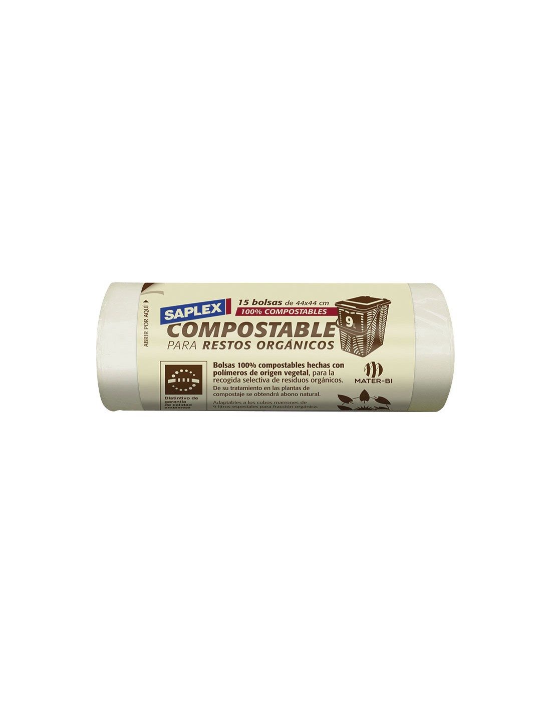 Bolsa basura SAPLEX 100% compostable. Especial para la recogida selectiva de residuos orgánicos. 44x44 cm. 15 unidades.