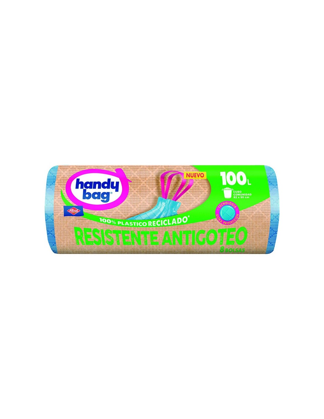 Bolsa basura ALBAL Handy Bag 100 litros 100 litros. Antigoteo. 100% plástico reciclado. Autocierre. 8 bolsas. Comunitaria.