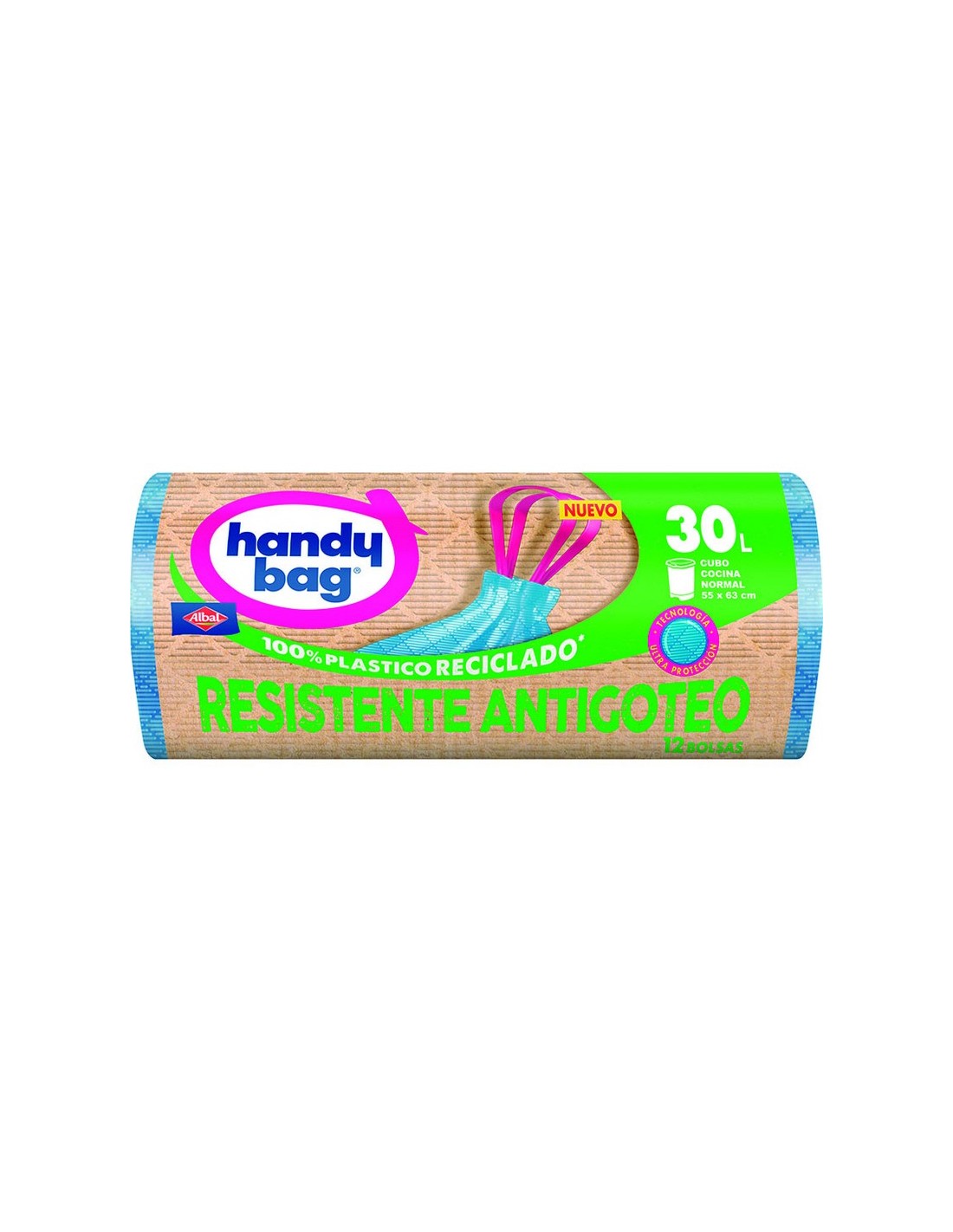 Bolsa basura ALBAL Handy Bag 30 litros 30 litros. Extra Resistente. Antigoteo. 100% plástico reciclado. Autocierre. Resistente antigoteo. 12 unid.