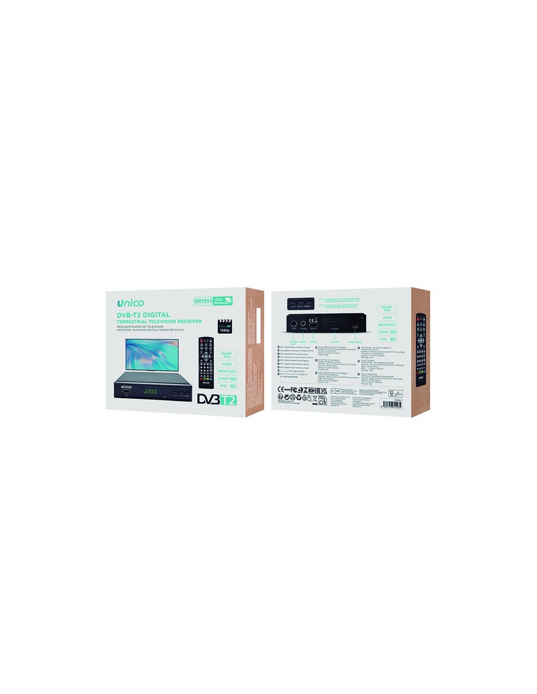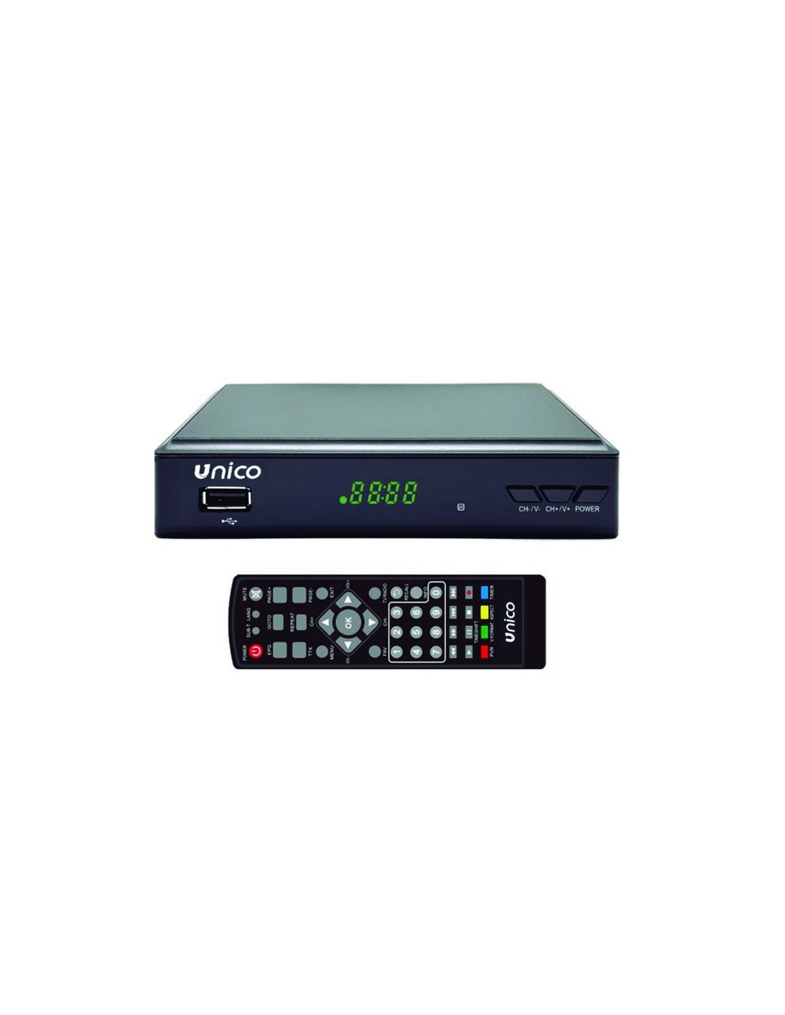UNICOReceptor TDT UNICO con USB y DVB-T2 Digital terrestre HD. Función grabar. Función Timeshift (pausa-directo): parar programar y continuar desde el punto de interrupción. Salida HDMI, euroconector, SPDIF coaxial y puerto USB 2.0. Reproduce MP3, imágenes y vídeo. Compatible Full HD. Búsqueda canales automática y manual. Formatos: 1080 p/i, 720 p y 576 p/i.