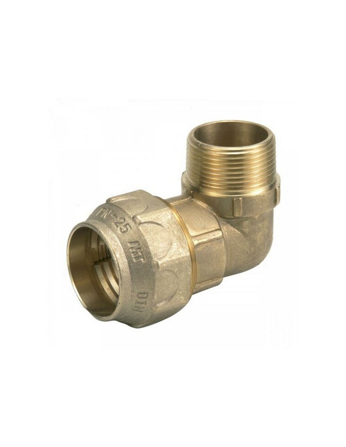 Accesorios compresión tubería PE MT serie ligera Latón a compresión para tuberías de polietileno de baja y alta densidad. Cuerpo y tuerca fabricados en latón en acabado arenoso. Soportan una presión de 16 bar y temperatura máxima de trabajo de 90ºC. Codificación unitaria con EAN13. Codo 90º. PE/M. 25x3/4\".
