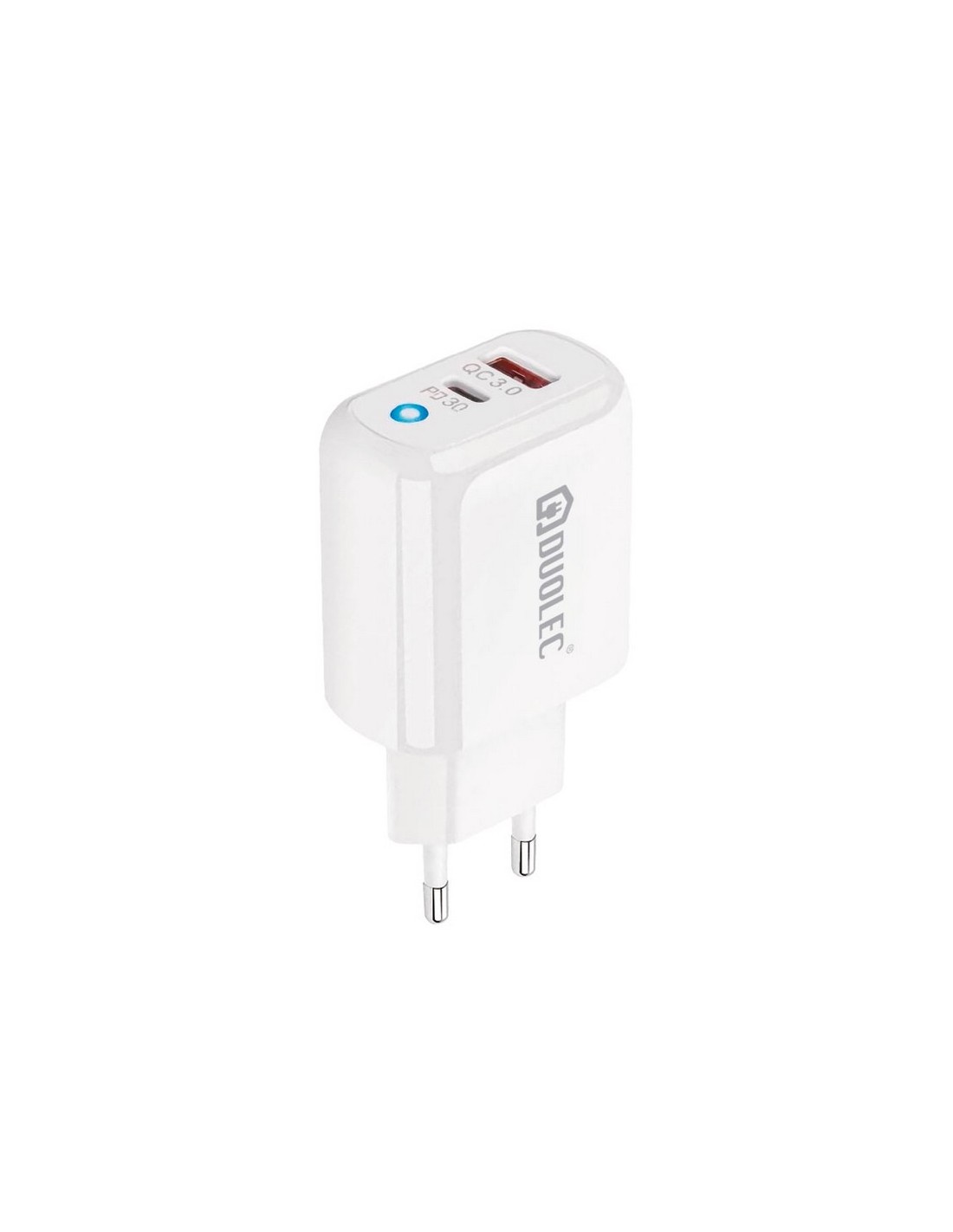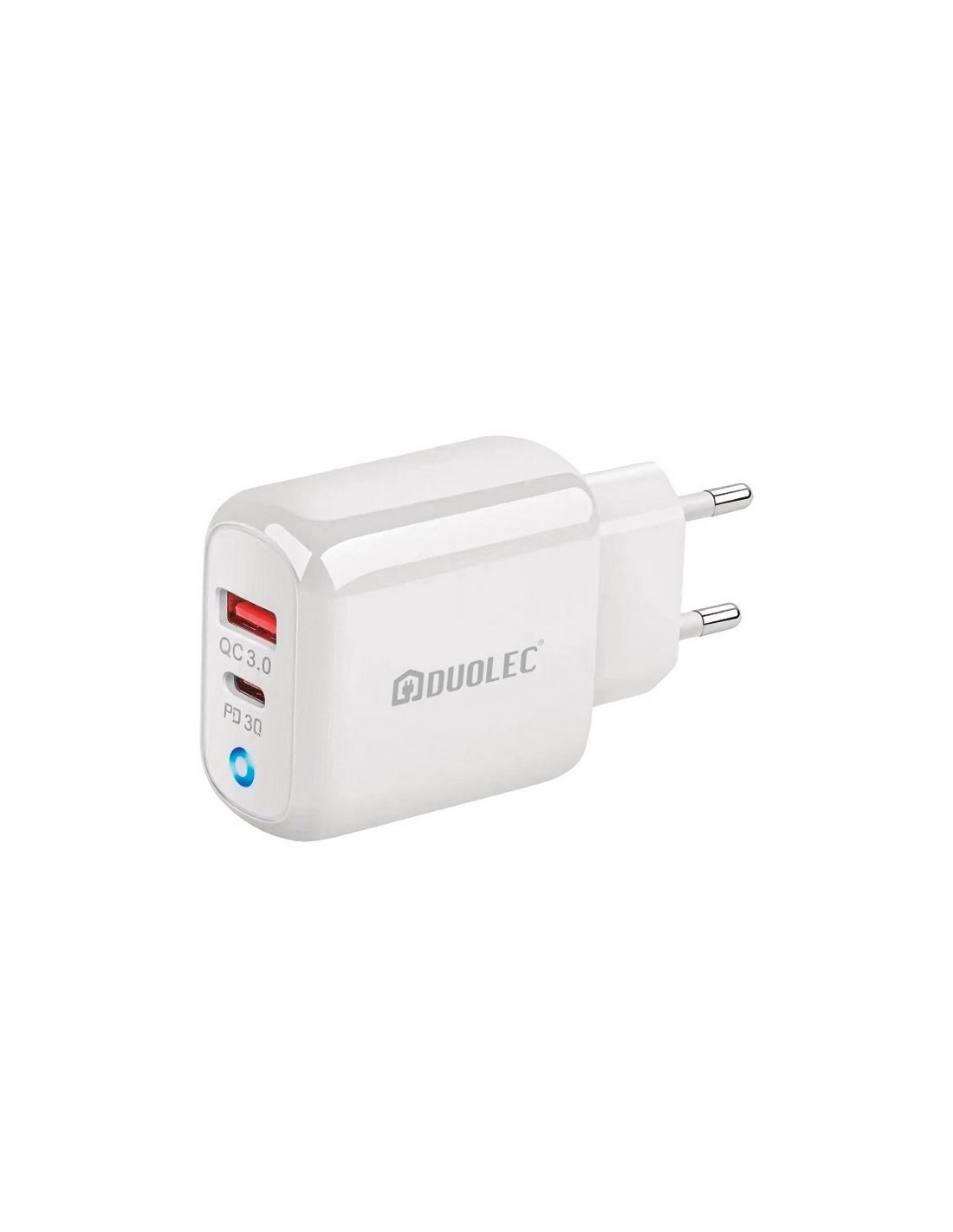 Cargador dispositivos dual DUOLEC CVR6 Tipo C y USB. Carga rápida. Blanco. Compatible con smartphones, tablets y otros dispositivos. 30W. Intensidad salida: 5 V/3 A, 9 V/2 A, 12 V/2,5 A, 15 V/2 A y 20 V/1,5 A. 30 W. Voltaje entrada: 110-240 V, 50/60 Hz y 0,5 A.