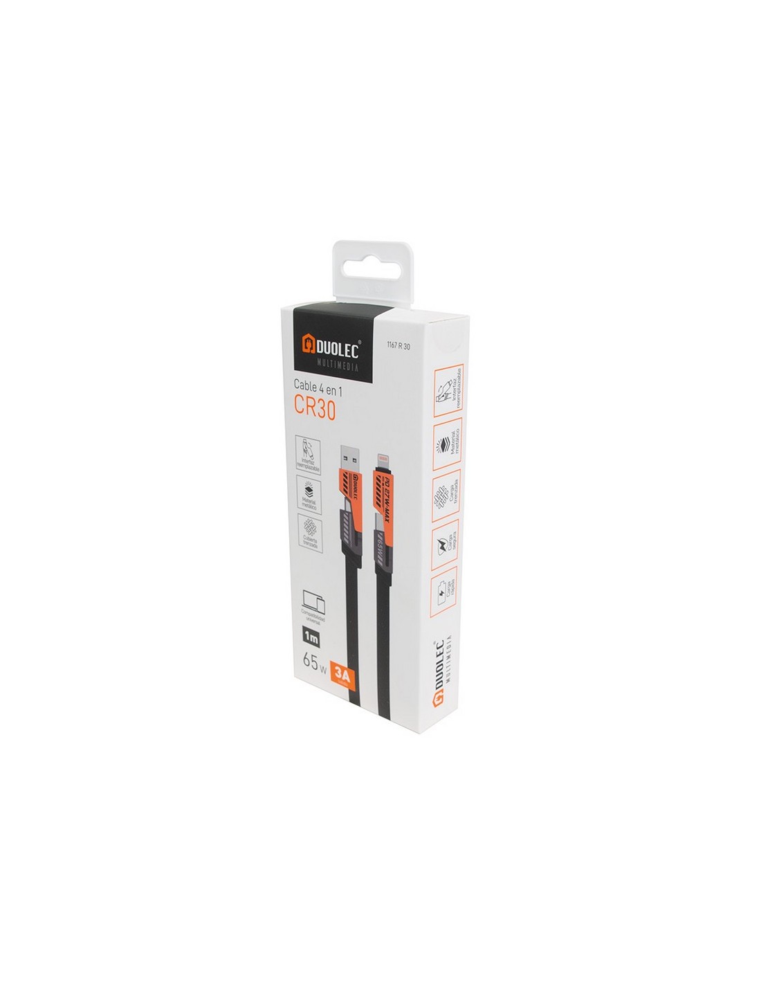 Cable de datos de carga rápida 4en1 DUOLEC CR30 Cargador múltiple, un solo cable satisface sus diferentes demandas. 4 en 1 Cable de carga múltiple con compatibilidad USB C a C, USB A a C, USB C a LIGHTNING y USB A a LIGHTNING. 65 W, 3A. Longitud: 1 m.
