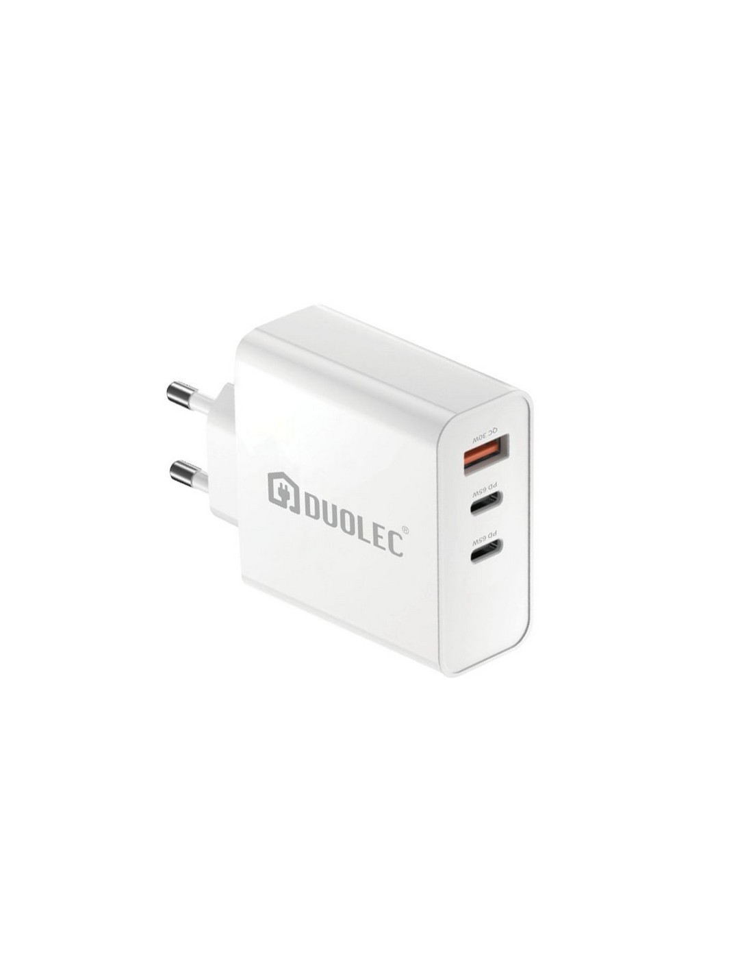 Cargador dispositivos triple DUOLEC CC32 Triple tipo C doble y USB a 65 W. Carga rápida. Blanco. Compatible con smartphones, tablets y otros dispositivos. Intensidad salida: 5 V/3 A.
