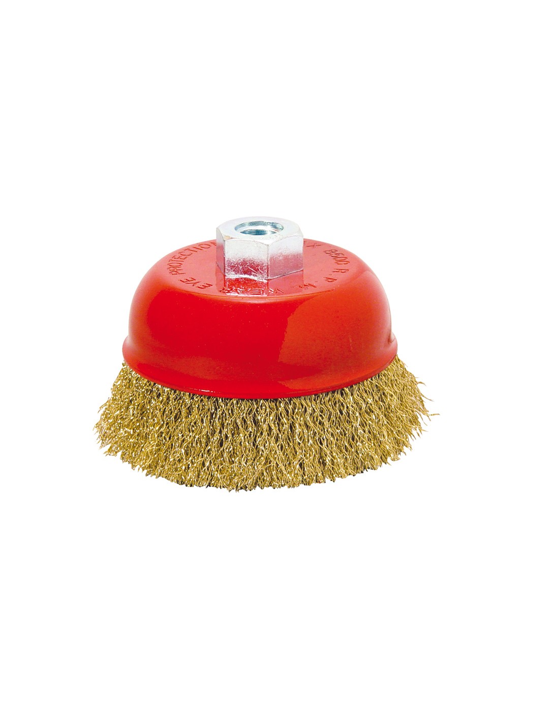 Cepillo taza RATIO. Alambre ondulado, acero latonado. Casquillo roscado M14. ø púas 0,30 mm.
