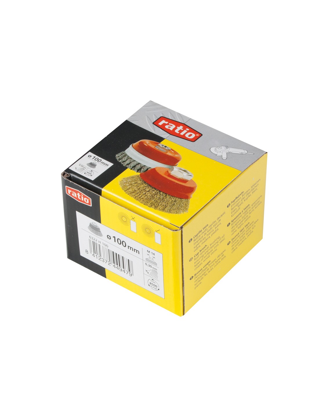 Cepillo taza RATIO. Alambre ondulado, acero latonado. Casquillo roscado M14. ø púas 0,30 mm.