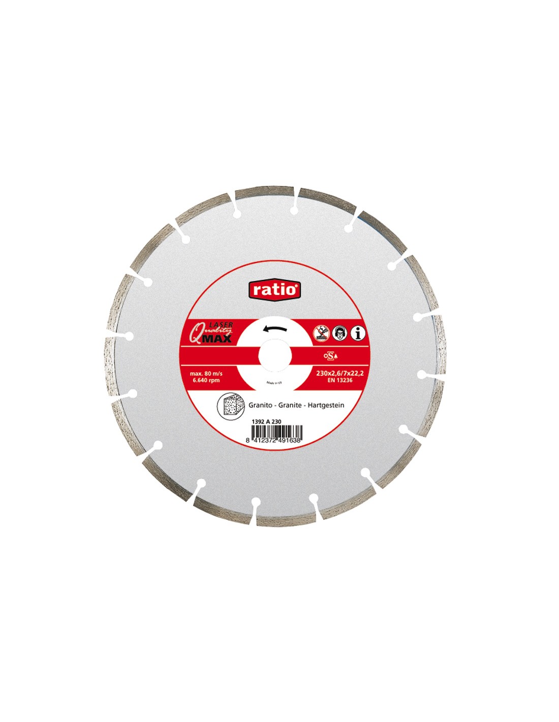 Disco diamante RATIO Quality Max Láser segmentado. Materiales muy duros: granito, hormigón viejo, pizarra, pórfido y otros materiales no abrasivos. 230x2,6x22,2 mm.