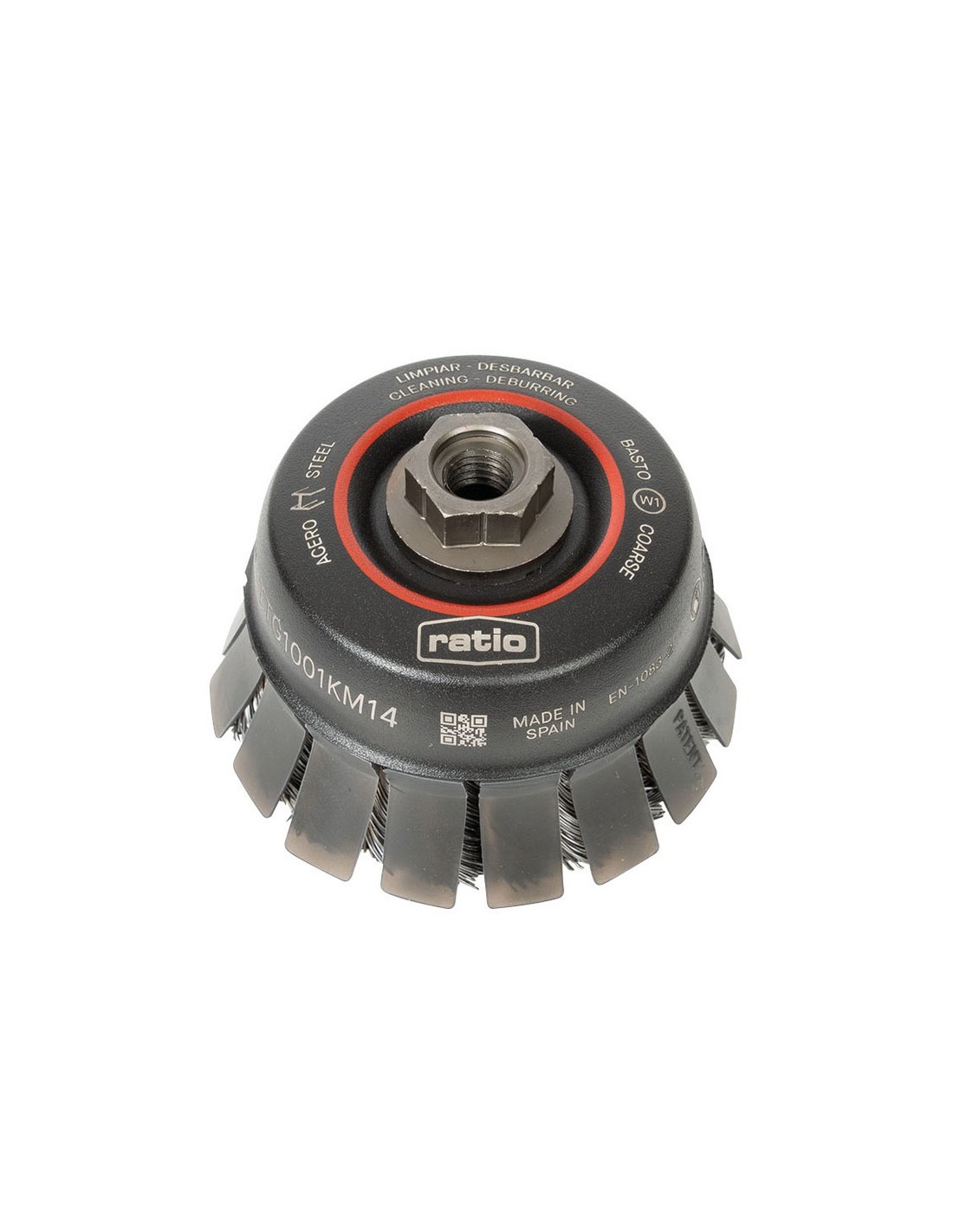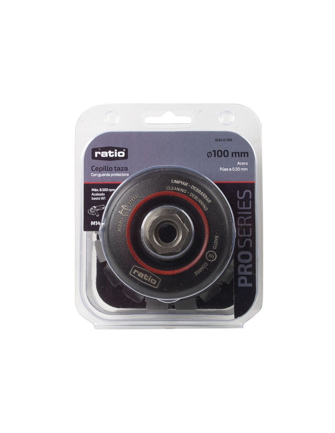 Cepillo taza con guarda protectora Ratio ProSeries 1623/1634 Alambre retorcido. Acero. Casquillo roscado M14. Para cepillados fuertes. Acabado basto (W1). ø 100 mm.