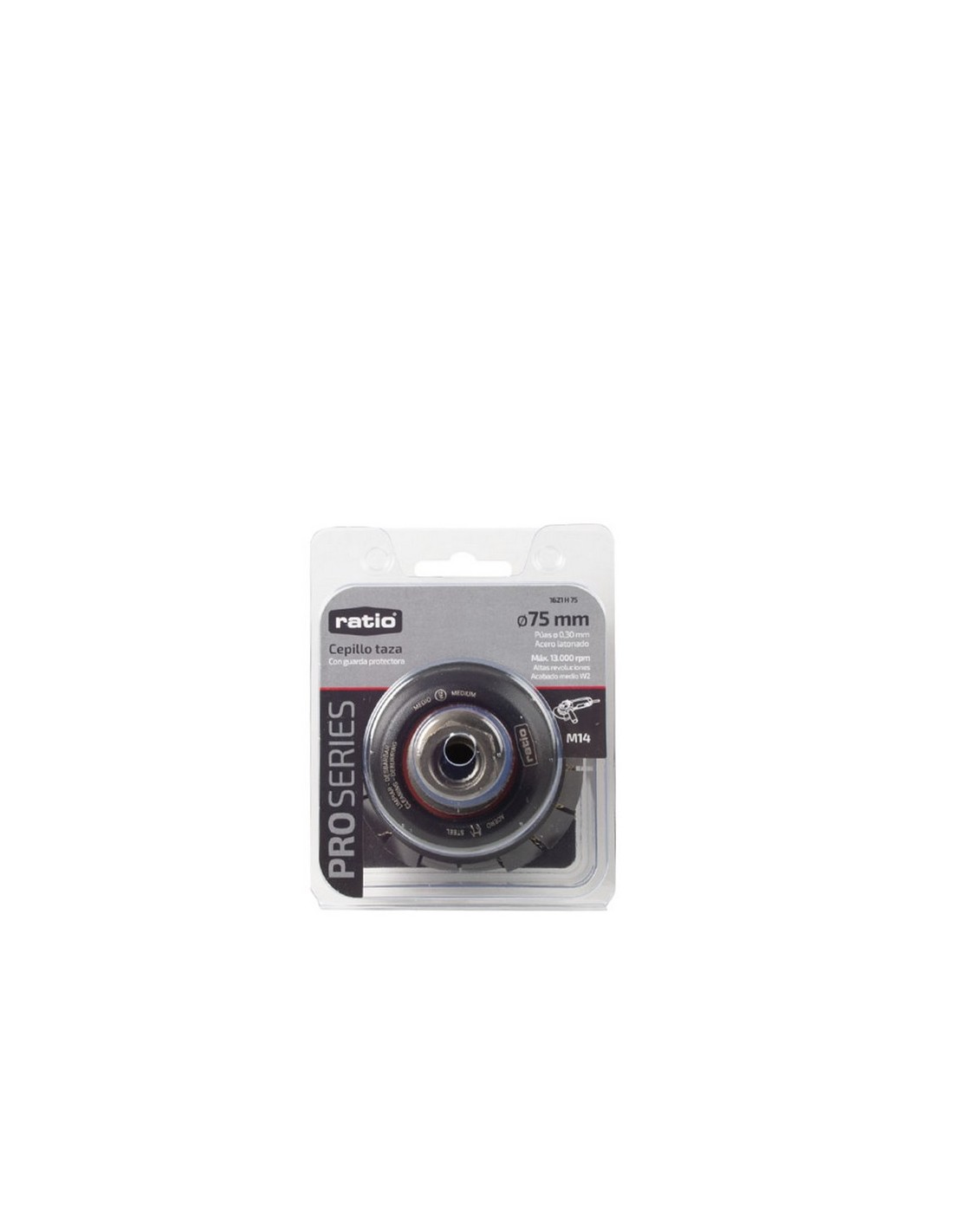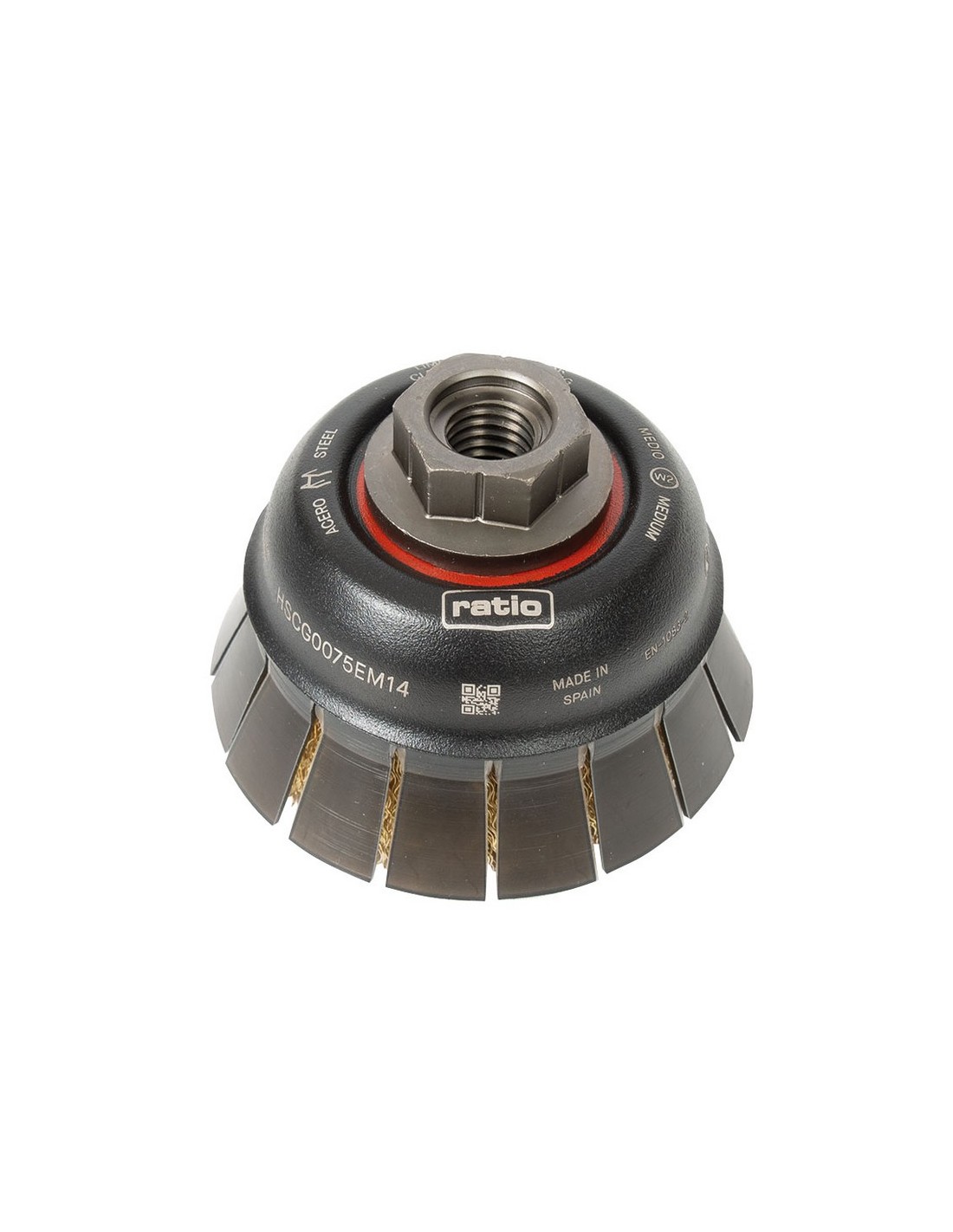 Cepillo taza con guarda protectora Ratio ProSeries 1621/1633 Alambre ondulado. Acero latonado. Casquillo roscado M14. Para óxidos, pinturas y adherencias. ø 75 mm.