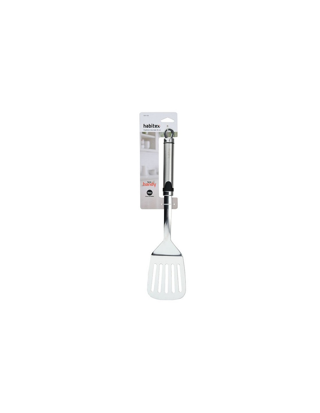 Accesorios de cocina HABITEX Handy inox Acero inox de alta resistencia. Mango ovalado con colgador. Aptos para lavavajillas. Espátula ranurada inox. 35 cm.