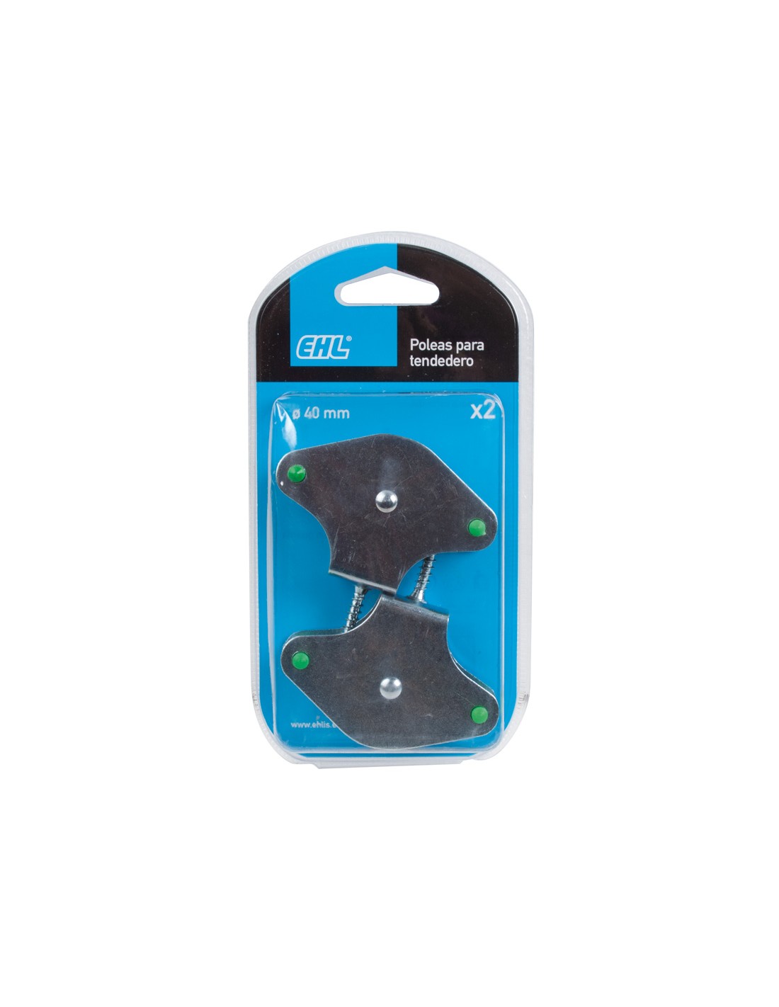 Polea tendedero EHL rueda metálica Rueda metálica ø 40 mm. Pintado verde. Con guarda. Acero galvanizado. Espiga rosca madera 40 mm. 2 unid.