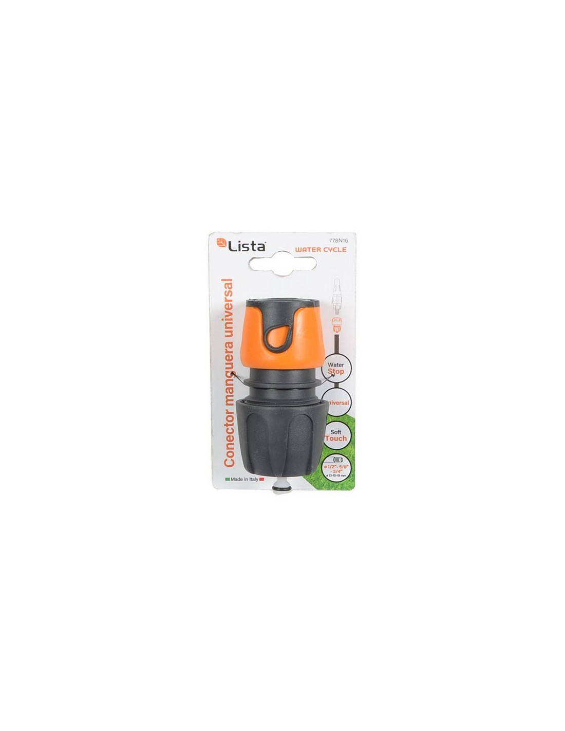 Conector manguera universal LISTA Water Cycle Realizado en plástico de alta calidad italiana. Un único conector sirve para las mangueras más utilizadas en el mercado de ø 13, 15 y 19 mm. ø interior 13/15/19 mm. Stop.