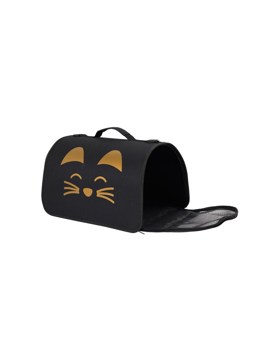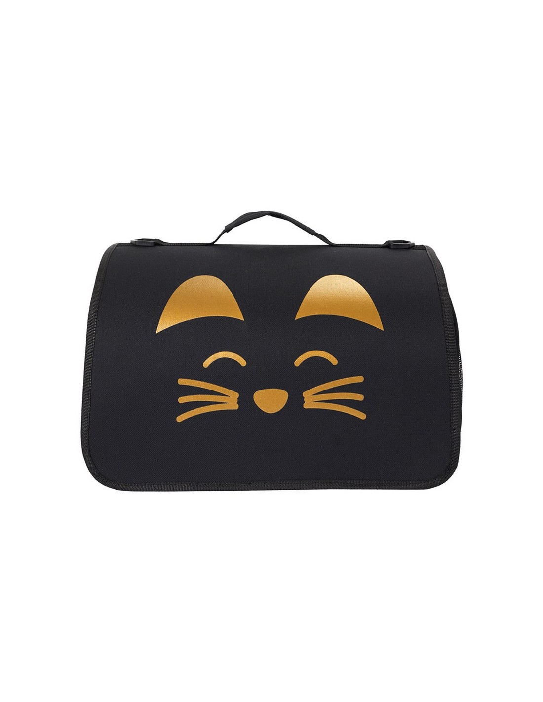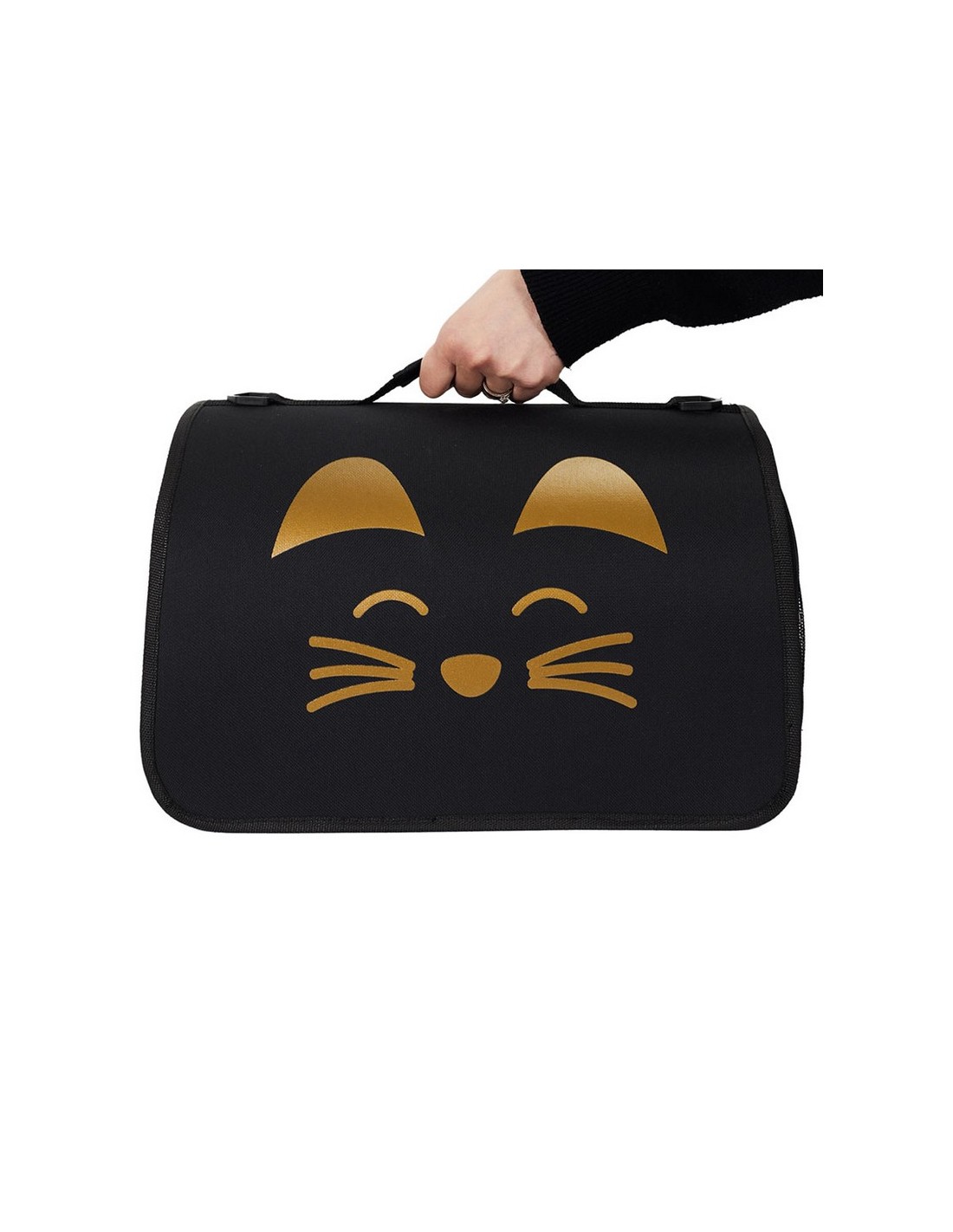 Transportin gato plegable Color negro. Impresión gato dorado. Dimensiones: 40x66xh.25 cm