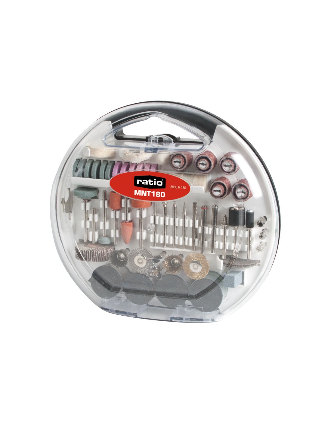 Accesorios minitaladro RATIO. Accesorios universales surtidos. Estuche plástico. MNT-180. 180 accesorios.
