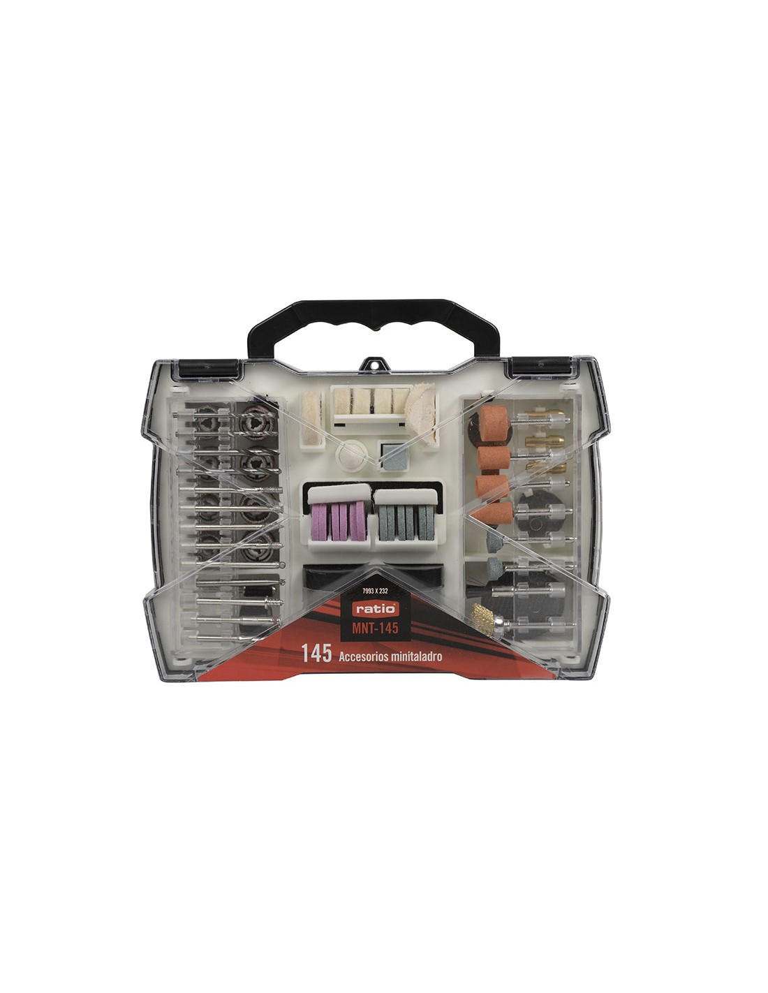 Accesorios minitaladro RATIO MNT-145 Accesorios universales surtidos. Estuche plástico. 145 accesorios.