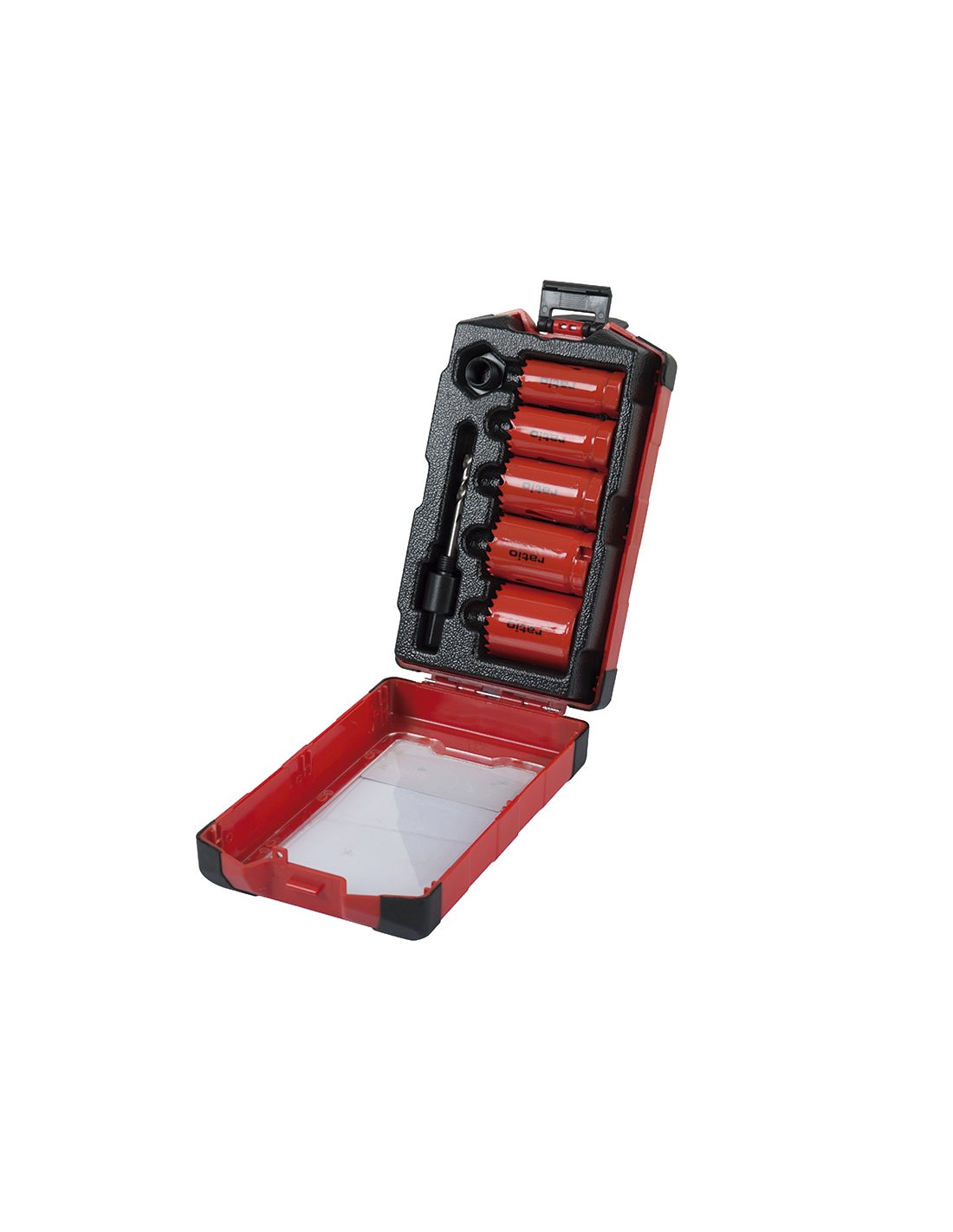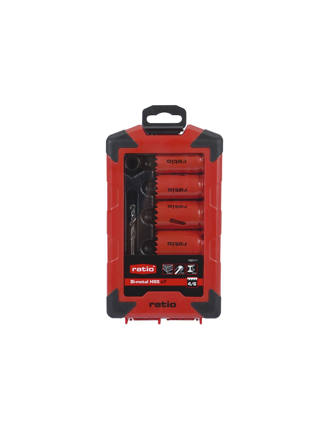 Sierra corona RATIO. Acero bimetal. Diente variable, paso de 4 a 6 dientes por pulgada. Estuche bimaterial 7 piezas. 5 coronas: ø 22, 25, 29, 32, 38 mm / 1 husillo / 1 adaptador.