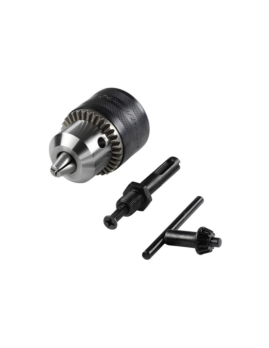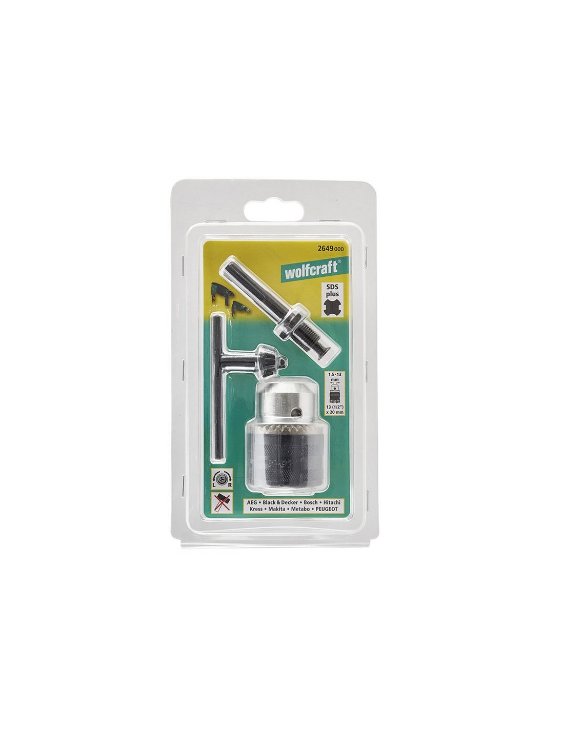 Portabrocas con adaptador SDS-Plus WOLFCRAFT Economy line Solo uso con giro, no válido para percusión. 1 portabrocas con rosca interior de 13 (1/2") x 20 mm, ancho de sujeción 1,5 - 13 mm. 1 llave para portabrocas S2A. 1 adaptador de portabrocas, SDS-plus con rosca de 13 (1/2") x 20 mm. Capacidad: ø 1,5 - 13 mm.