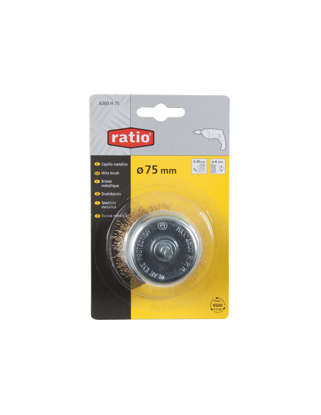 Cepillo copa RATIO. Acero latonado ondulado. Vástago 6 mm. Púas 0,30 mm. ø 50 mm.