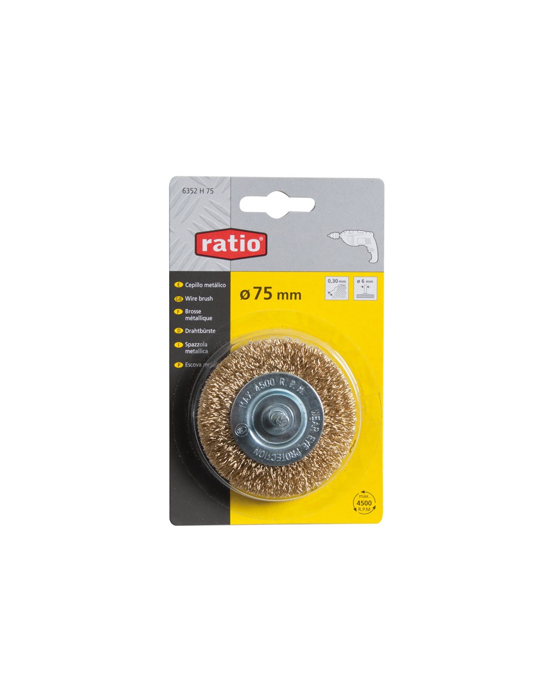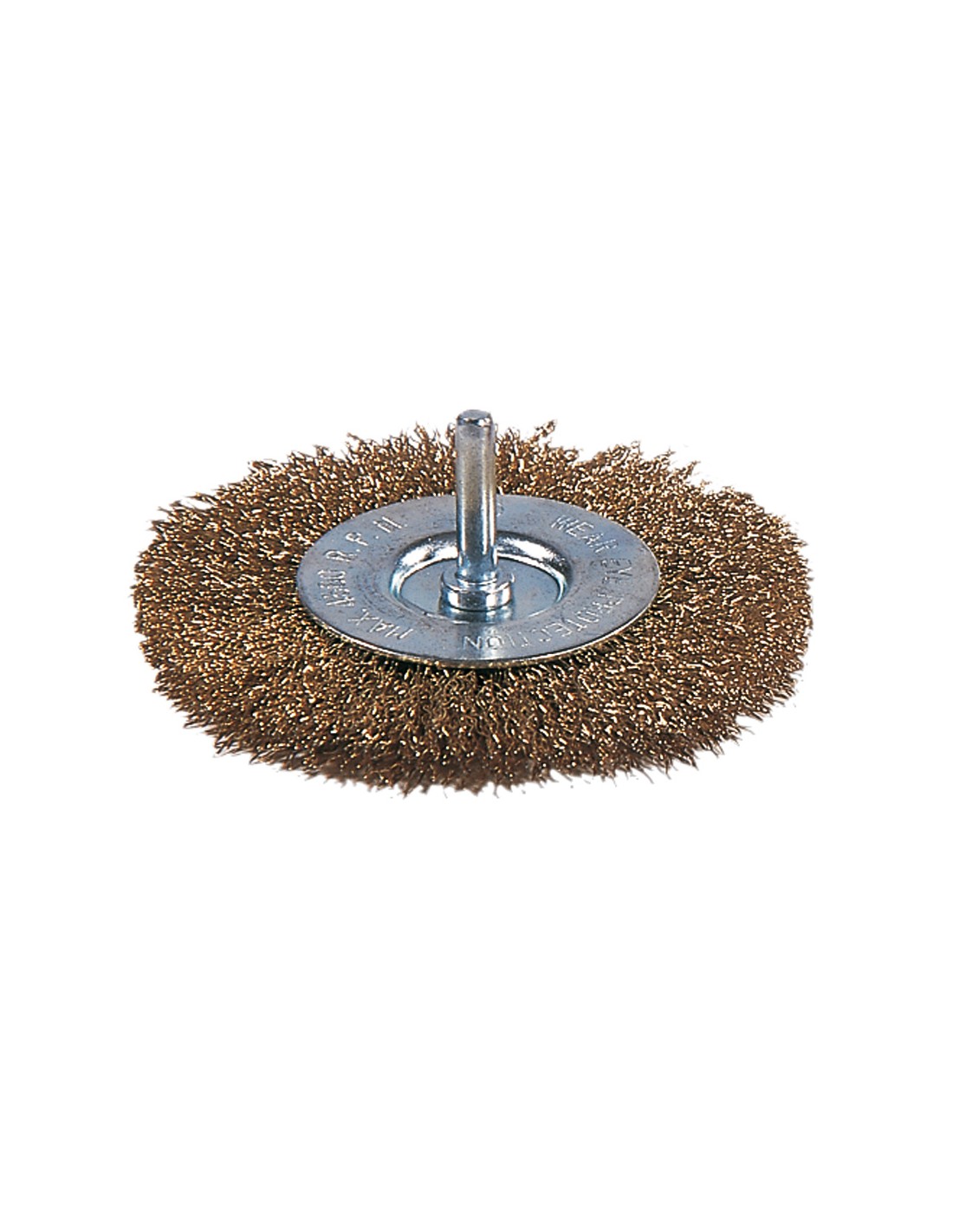 Cepillo circular RATIO. Acero latonado ondulado. Vástago 6 mm. Púas 0,30 mm. ø 100 mm.