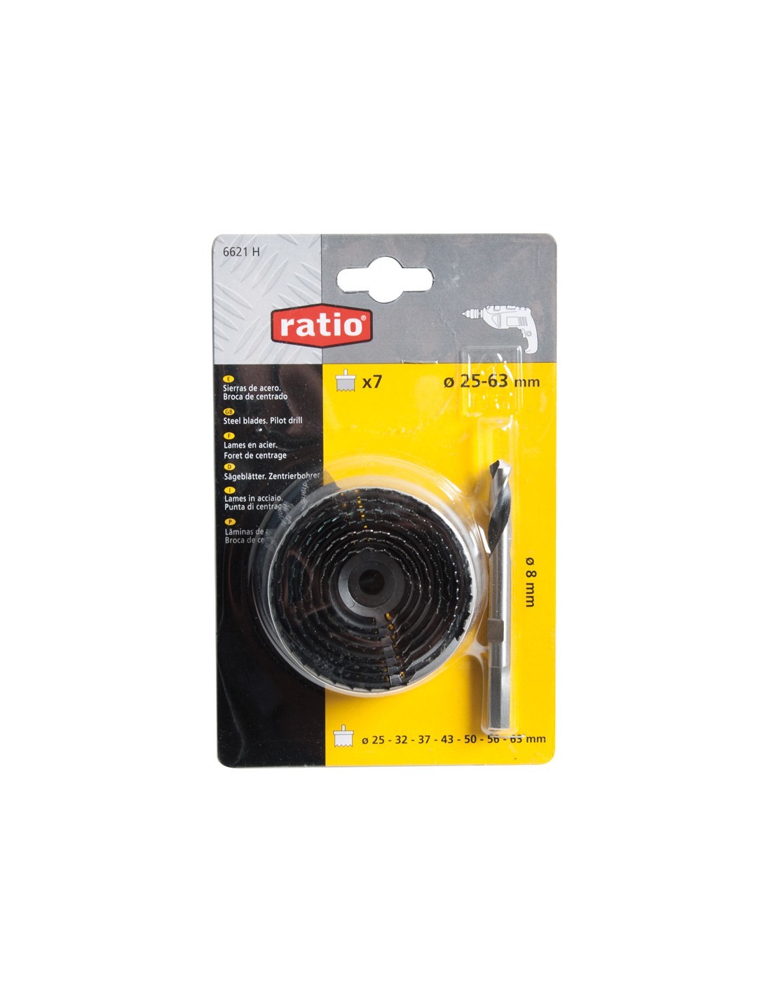 Sierra corona RATIO. Hojas intercambiables. Para corte de madera, yeso, plástico. 3 hojas ø 60, 67, 74 mm. Vástago hexágonal 8 mm.