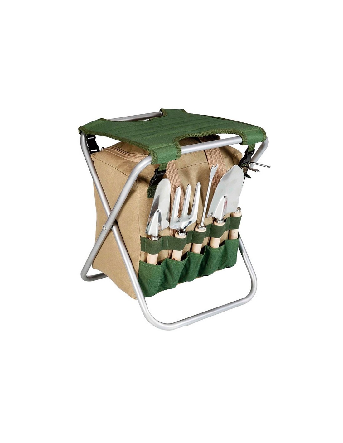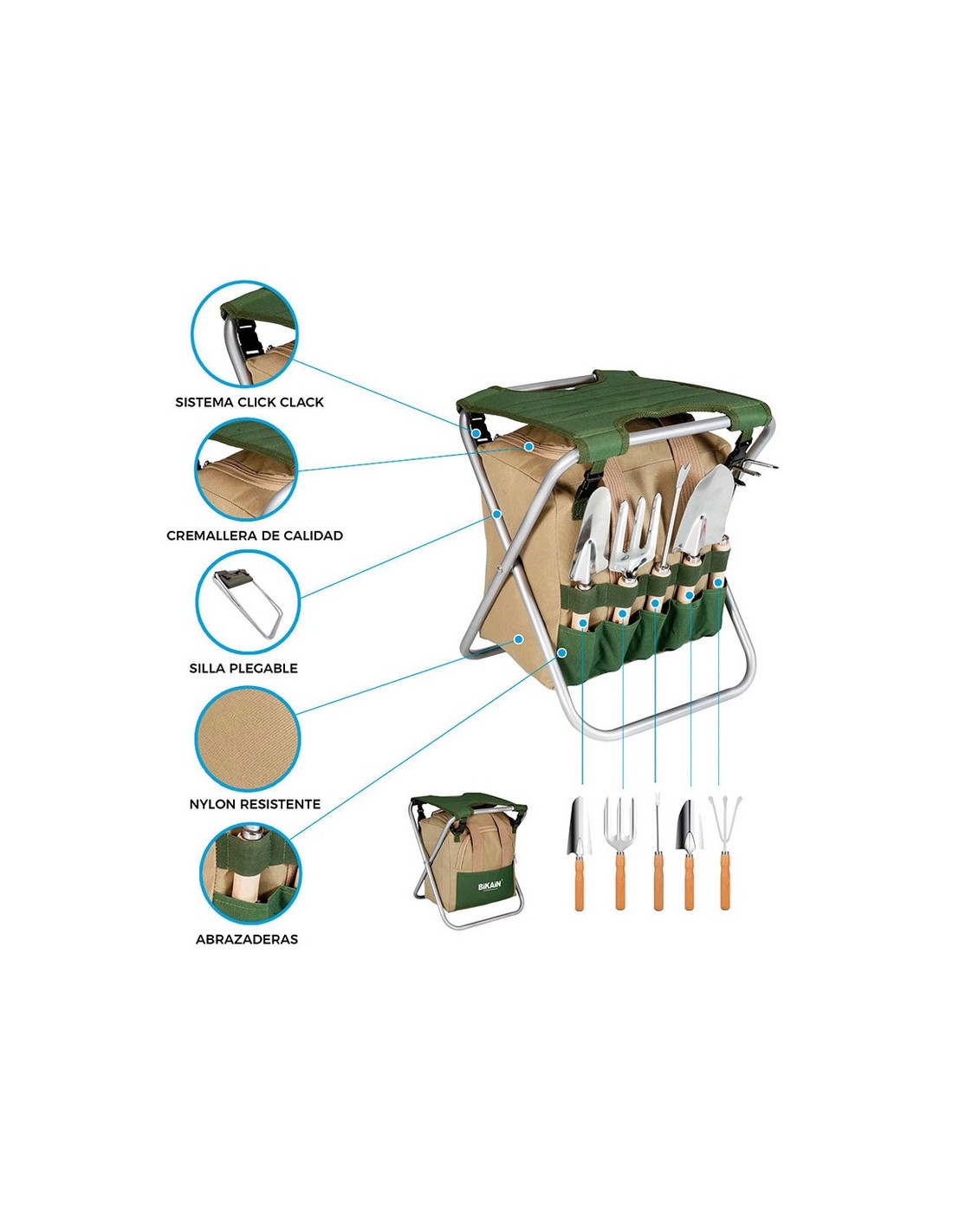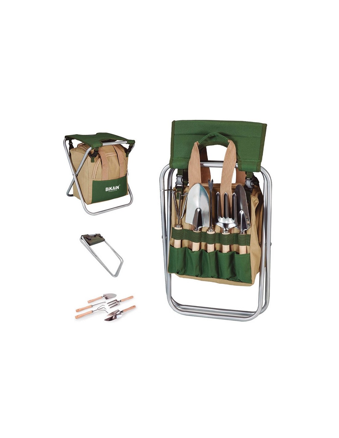 Kit taburete + bolsa + herramientas Kit compuesto por taburete de jardin plegable 30x30x45 cm. Bolsa portaherramientas y 5 herramientas 30 cm ( Pala ancha, transplantador, cultivador, tridente y escarbador). Material acero inox.