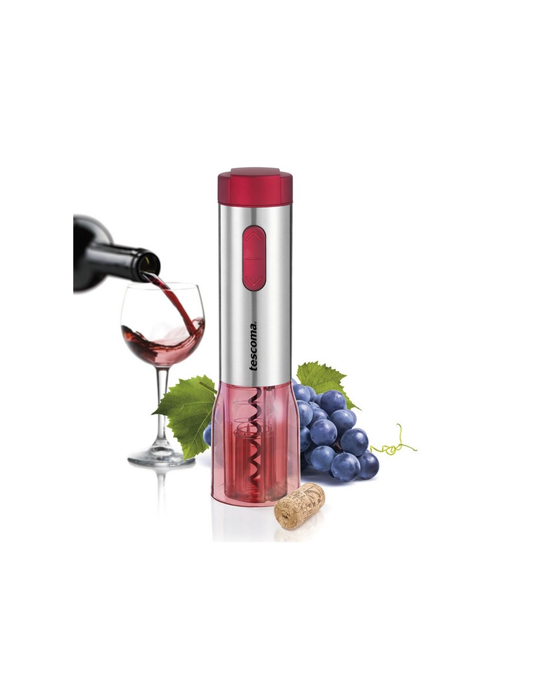 Sacacorchos eléctrico TESCOMA Uno Vino Acero inox/ABS. Espiral antiadherente alta calidad, corta-cánulas y luz Led. Funciona 6 pilas AAA de 1,5 V. (no incluidas). ø 6xh.22,5 cm.