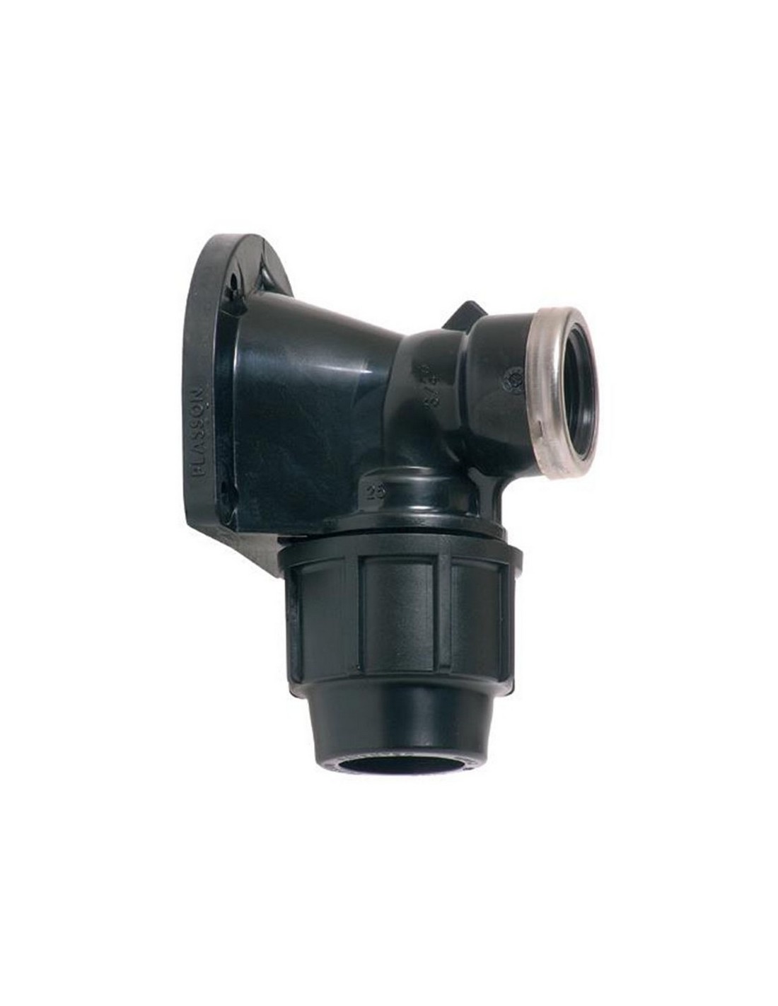 Accesorios de compresión para circuitos de agua PLASSON Serie 6 Para circuitos de agua potable. Material homologado por todas las compañías de agua de España. Fabricación Presión máx. 16 Bar. Fabricado en polipropileno block de alta calidad con juntas tóricas de nitrilo NBR y casquillos de Acetal POM que garantiza 100% estanqueidad. Cumple normas europeas con ensayos que garantizan 50 años de vida. Codo 90º mixto mural. 20 mm. 25 mm. 1 unid.