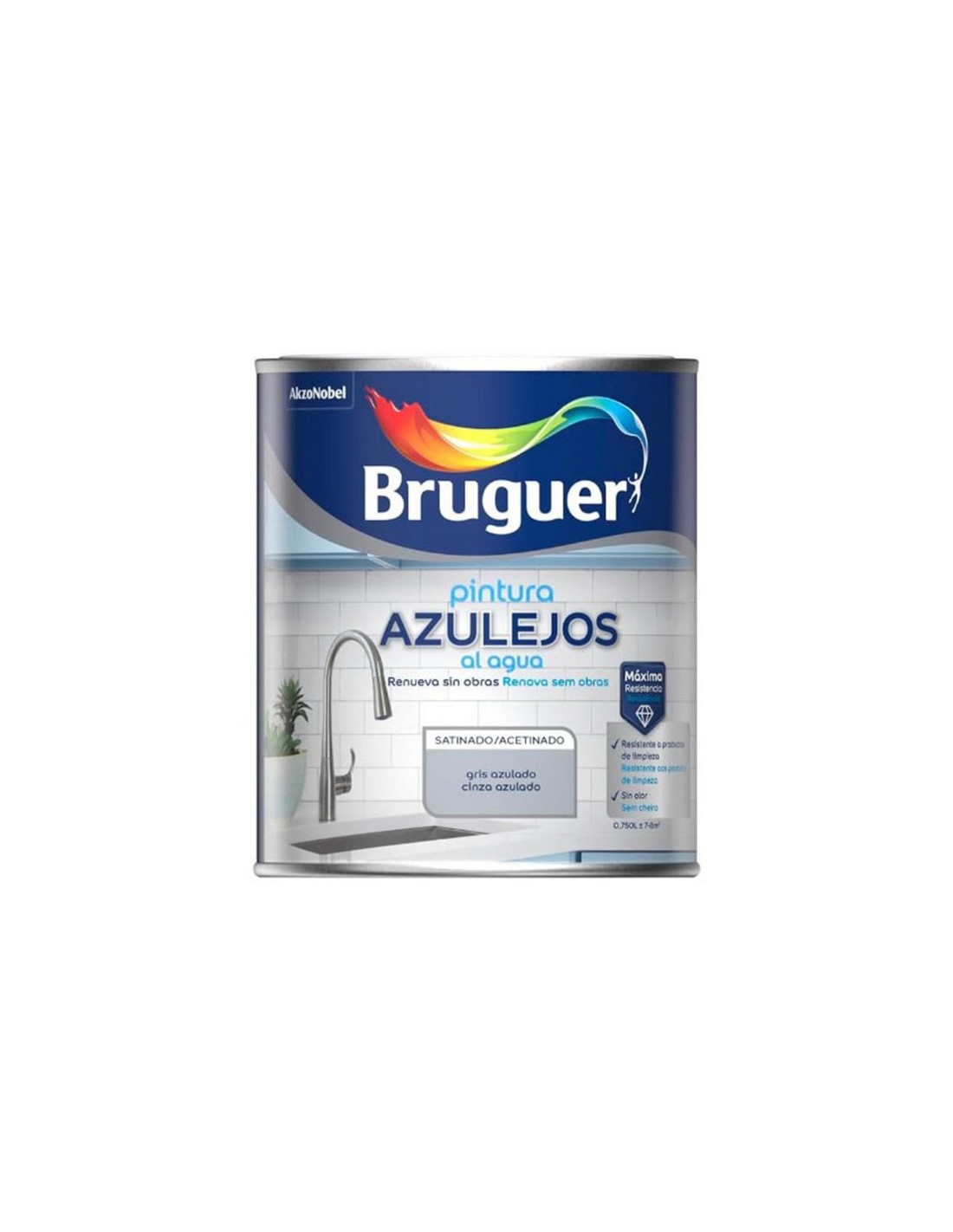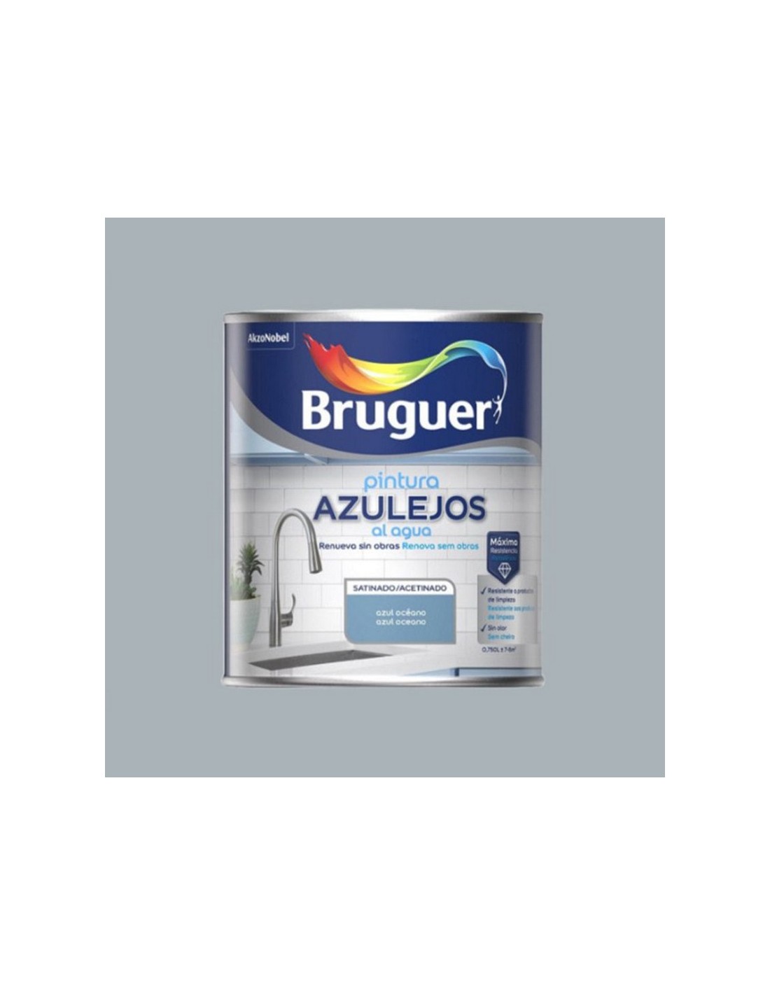 Esmalte para azulejos satinado al agua BRUGUER Muy resistente a condiciones propias de cocinas y baños. Cobertura 7,5 m²/l. (por mano). Tiempo de secado 1-1,5. Monocapa. Secado rápido. Lavable. 750 ml. Gris azulado. 750 ml.