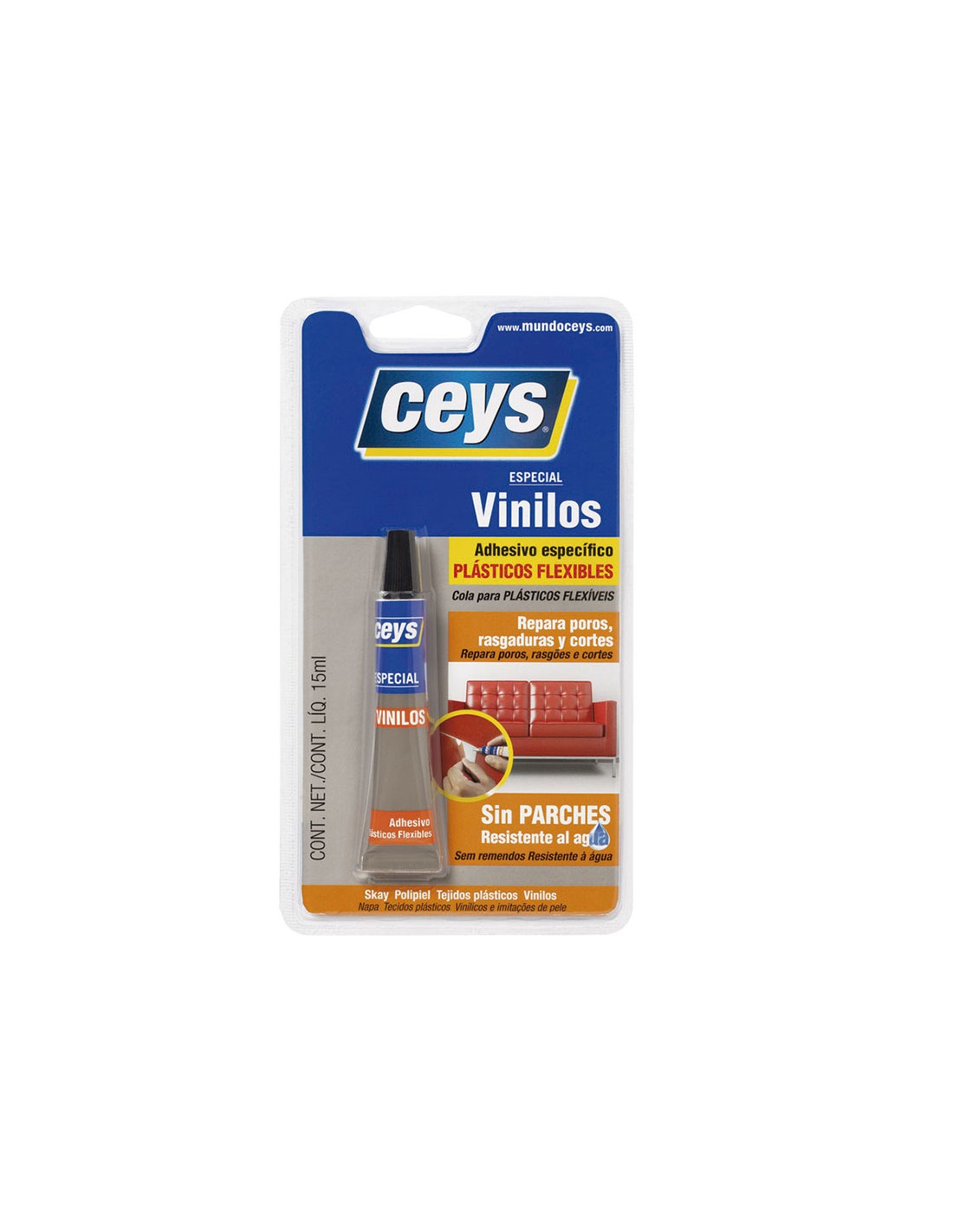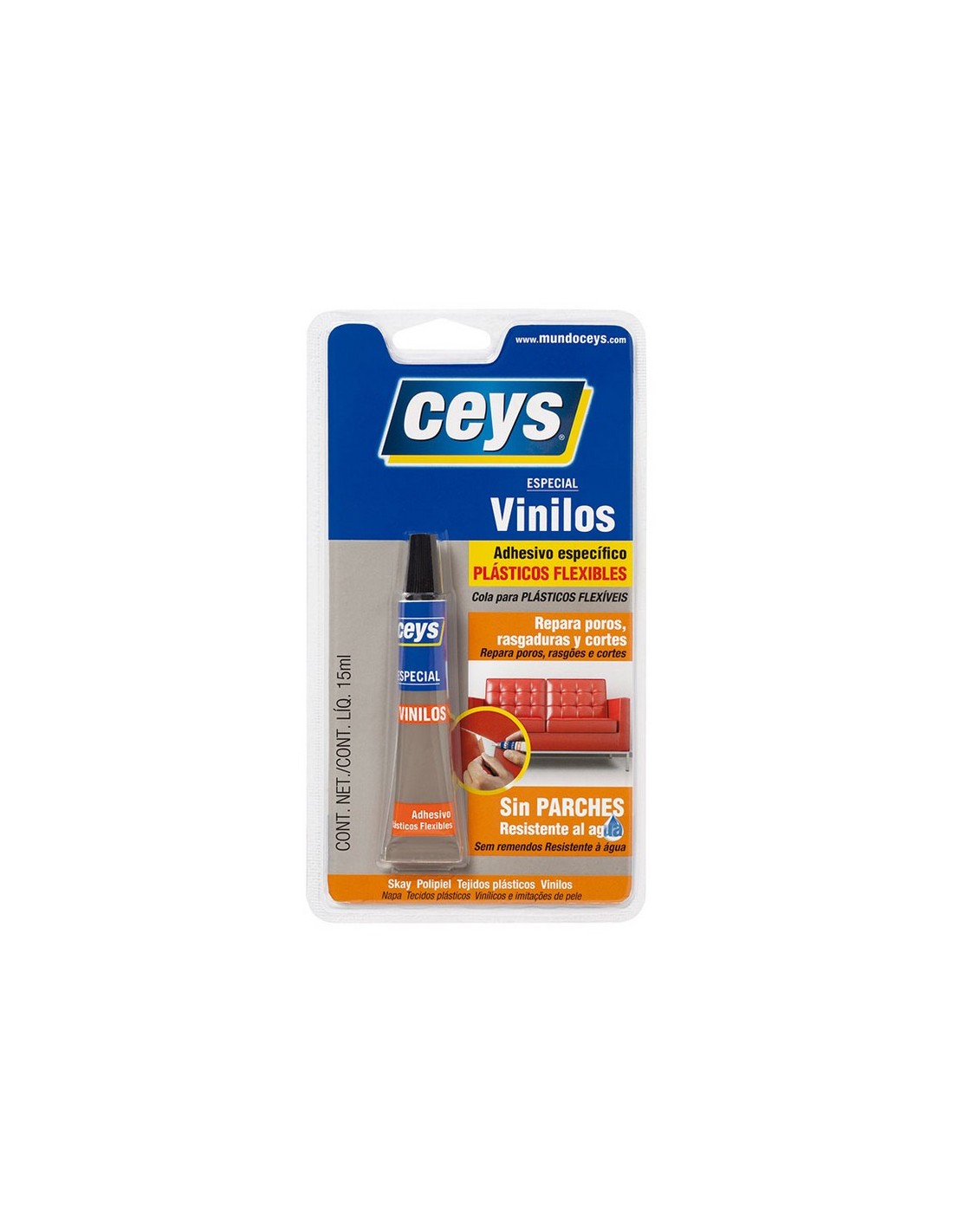 Adhesivo CEYS Vinilceys. Repara todo tipo de plásticos flexibles, vinílicos, etc., sin necesidad de parches (hinchables, skay, útiles de playa, etc.). 15 ml.
