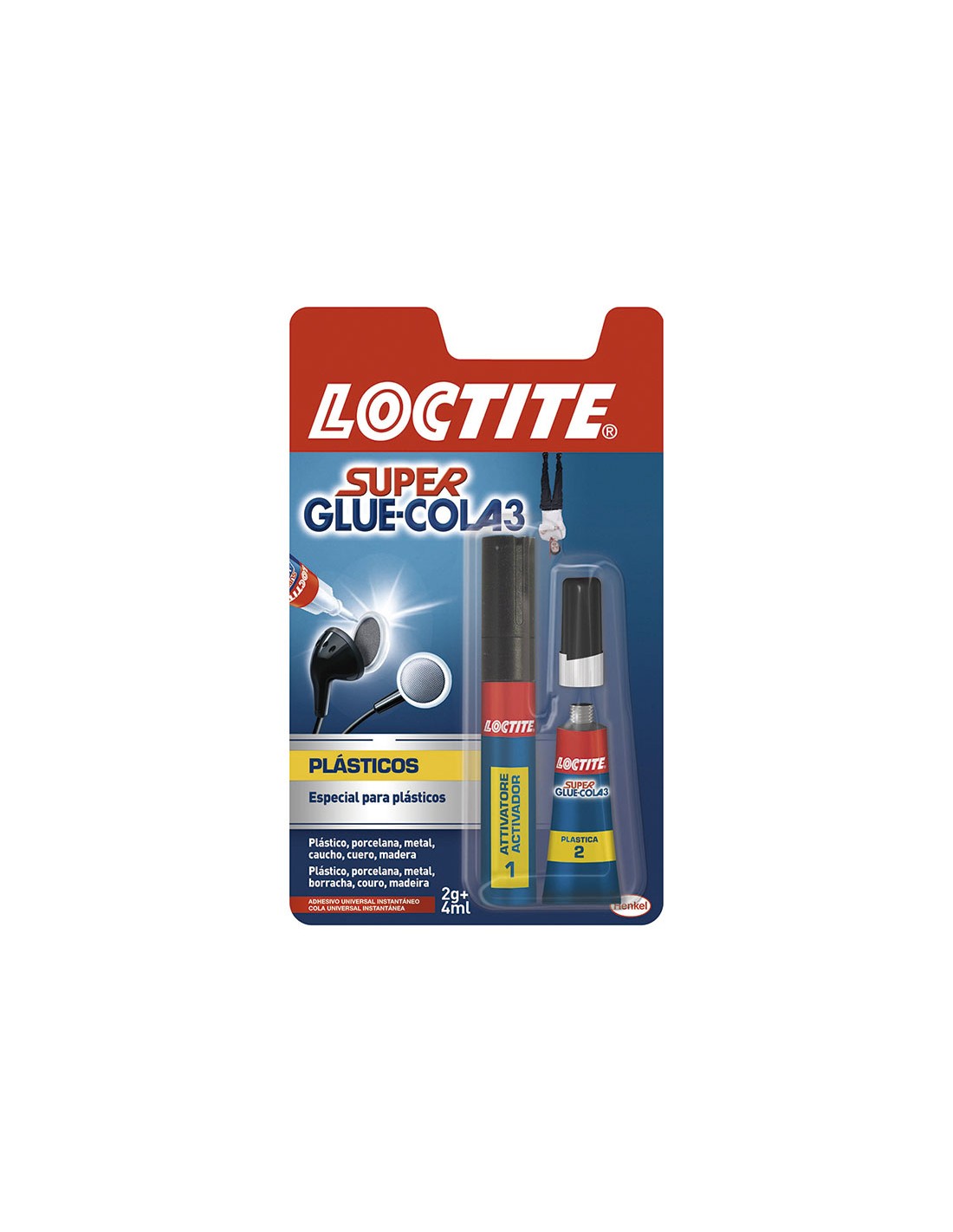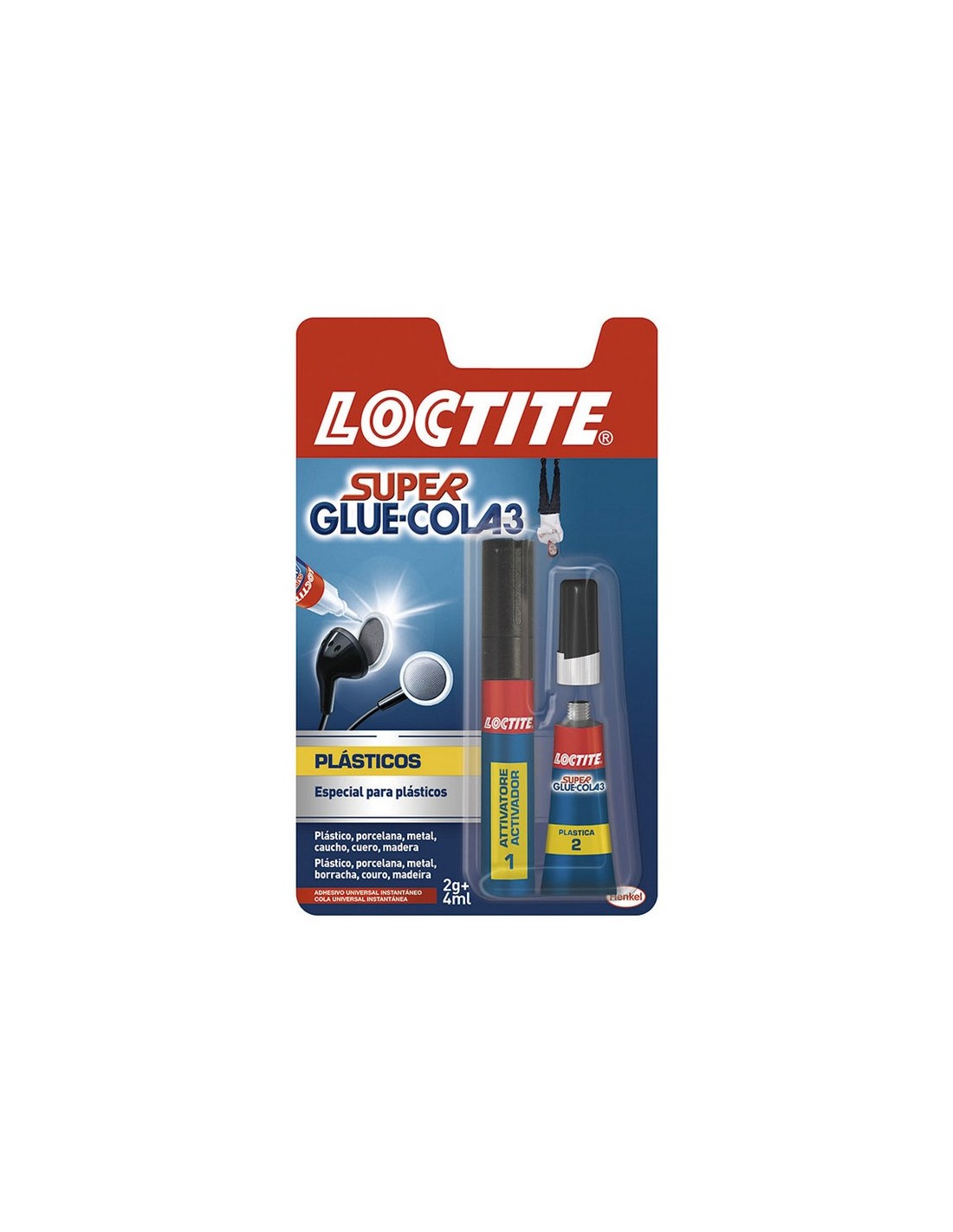 Adhesivo instantáneo LOCTITE Super Plastics. Pega en 3 segundos todo tipo de materiales plásticos: polietileno, polipropileno, metacrilato, ABS, PVC, excepto PTFE. Activador fórmula potenciada con Fixactive. Activador 4 ml. Adhesivo 2 gr.