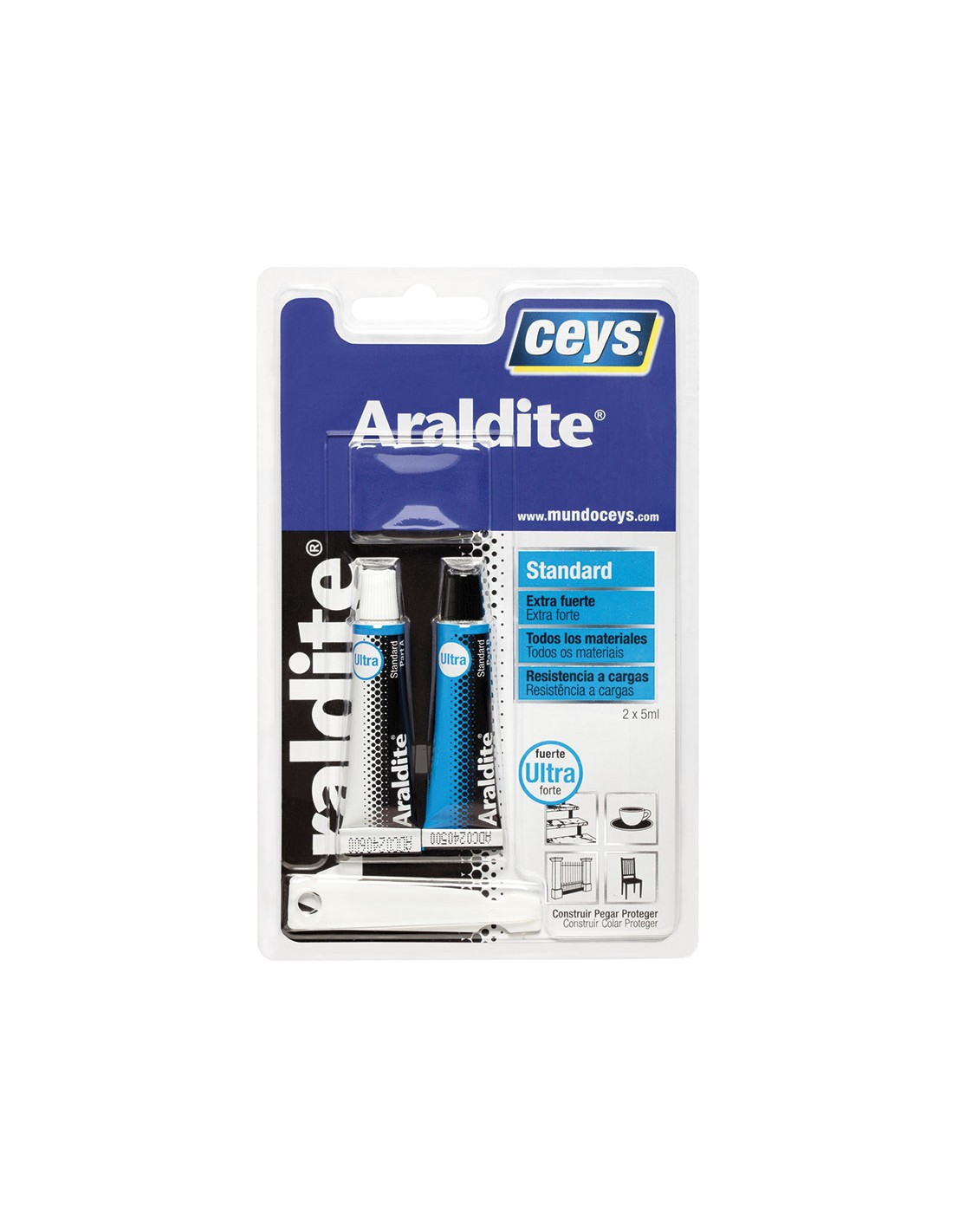 Adhesivo CEYS Araldite standard El adhesivo más fuerte del mundo. Une prácticamente todos los materiales. Rellena y resiste golpes y vibraciones. Blíster pequeño. 5 + 5 ml.