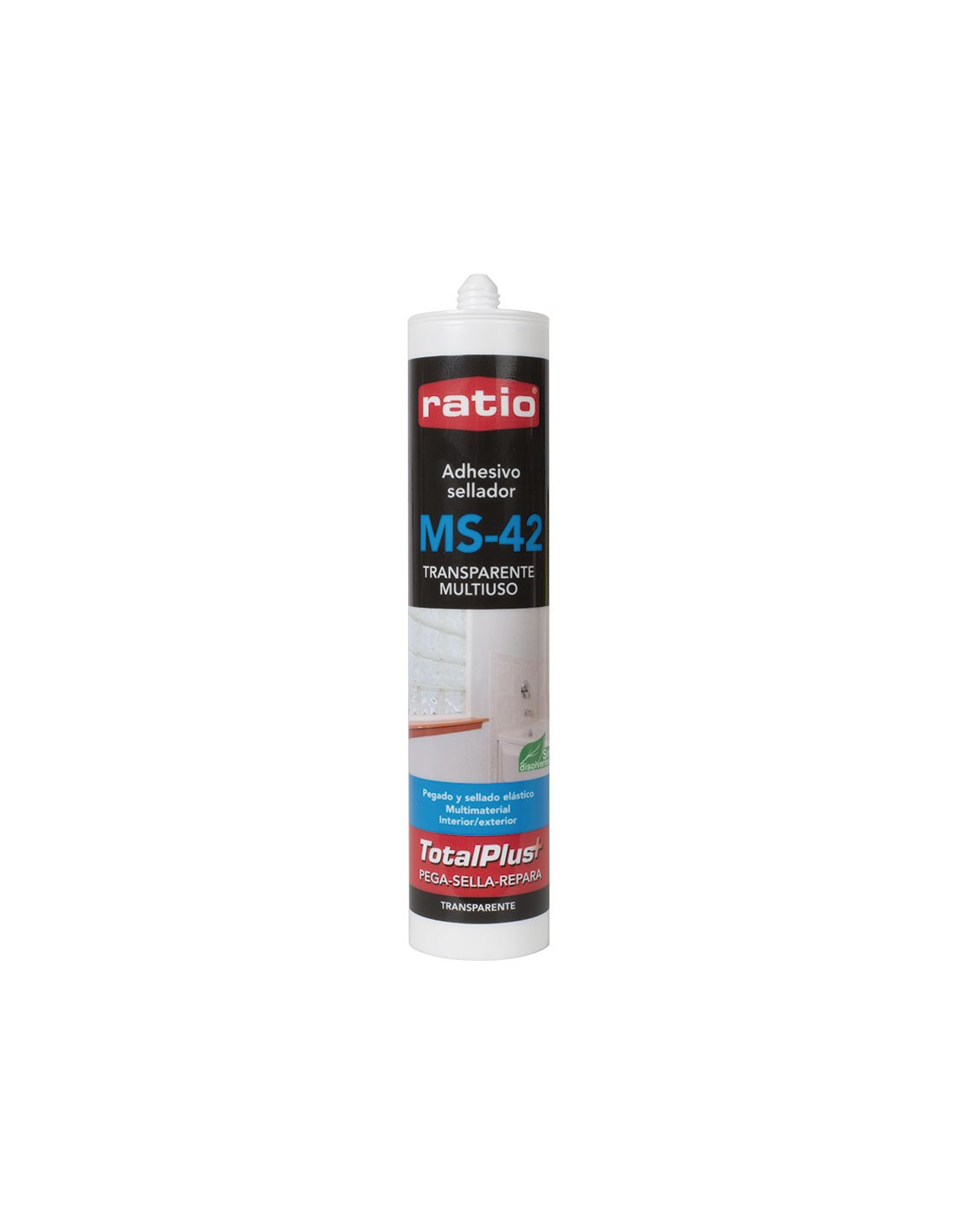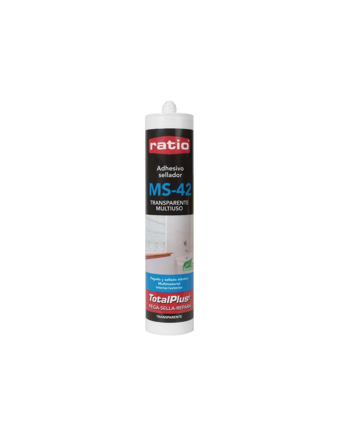 Sellador adhesivo RATIO MS Polímero MS-42. Pegado y sellado de cualquier material, como espejos, cristales o mamparas. Sin disolventes. En exterior se recomienda su uso sólo como adhesivo. Resistencia a la temperatura de -40º C a +100º C. Temperatura de aplicación de +5º C a 35º C. Pintable. Alargamiento de rotura > 150 % aprox. Adhiere sobre superficies húmedas e incluso bajo el agua. Ideal para fijar elementos sujetos a vibraciones. Cristal 290 ml.