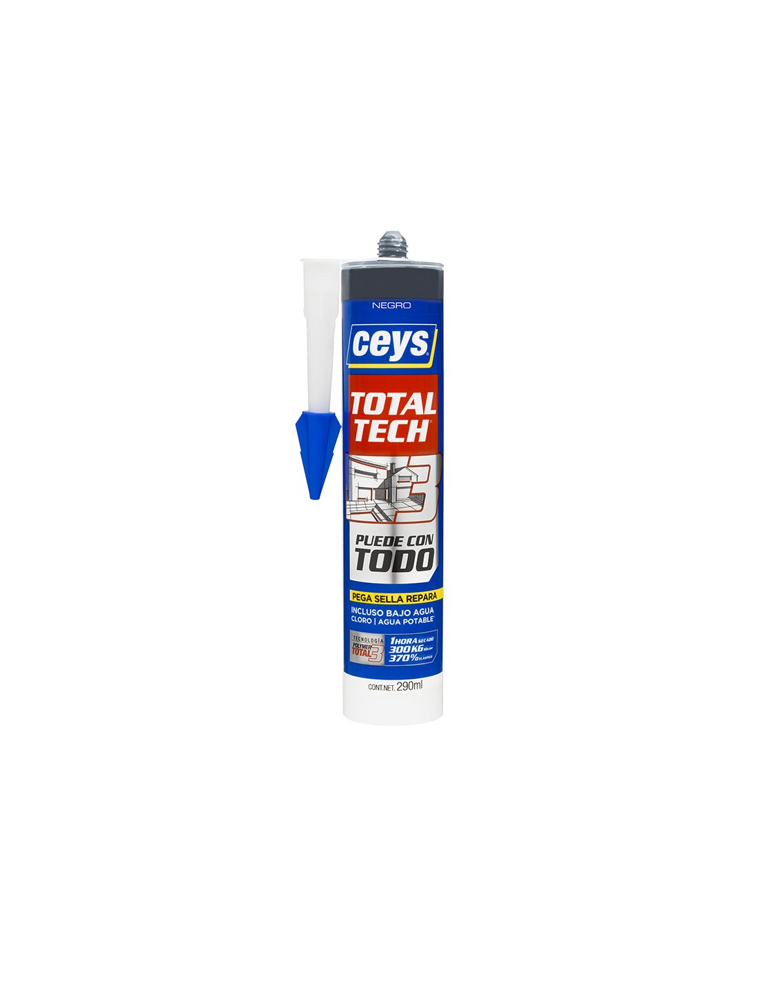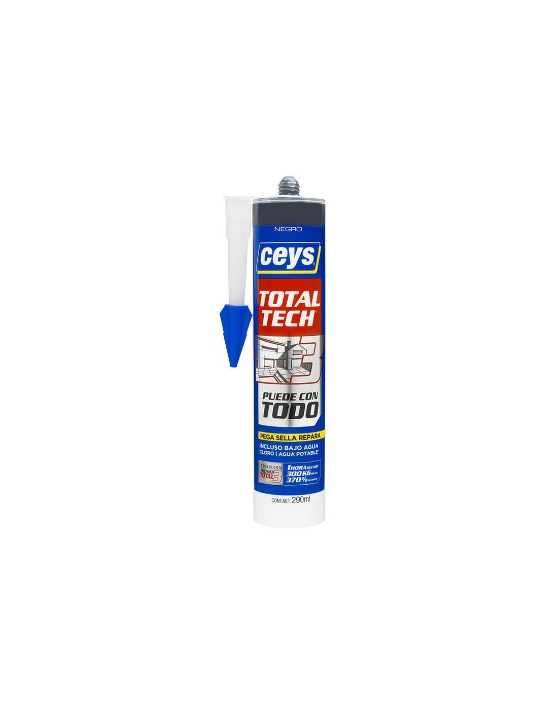 Sellador elástico CEYS TOTAL-TECH. La adherencia de un poliuretano y la elesticidad de una silicona. Elongación máxima hasta rotura 420%. Resistencia desde -40ºc a +90ºC. Cartucho 290 ml. Negro.