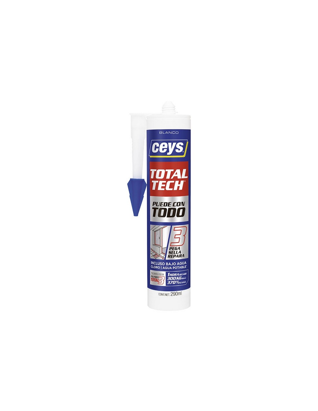 Sellador elástico CEYS TOTAL-TECH. La adherencia de un poliuretano y la elesticidad de una silicona. Elongación máxima hasta rotura 420%. Resistencia desde -40ºc a +90ºC. Cartucho 290 ml. Blanco.