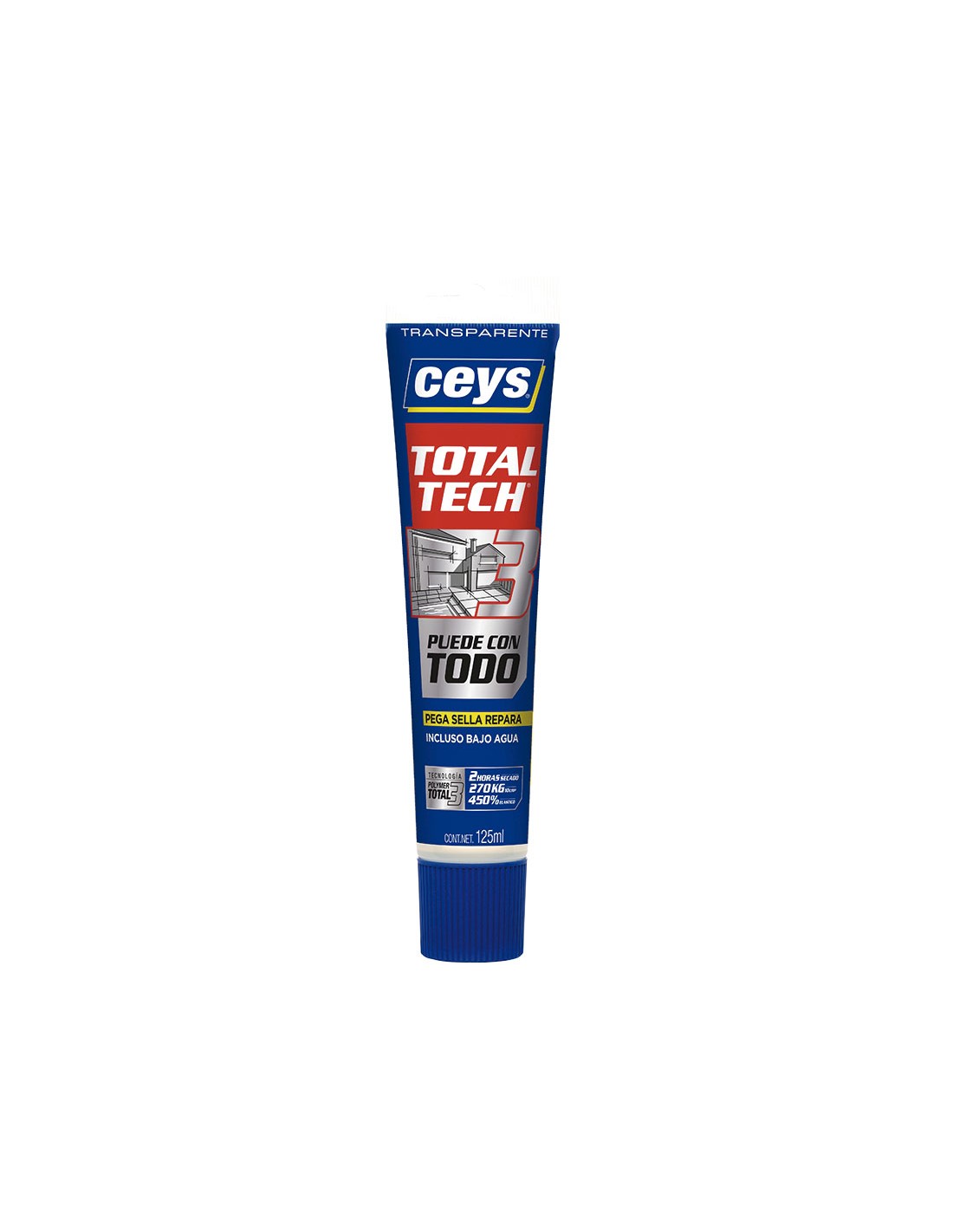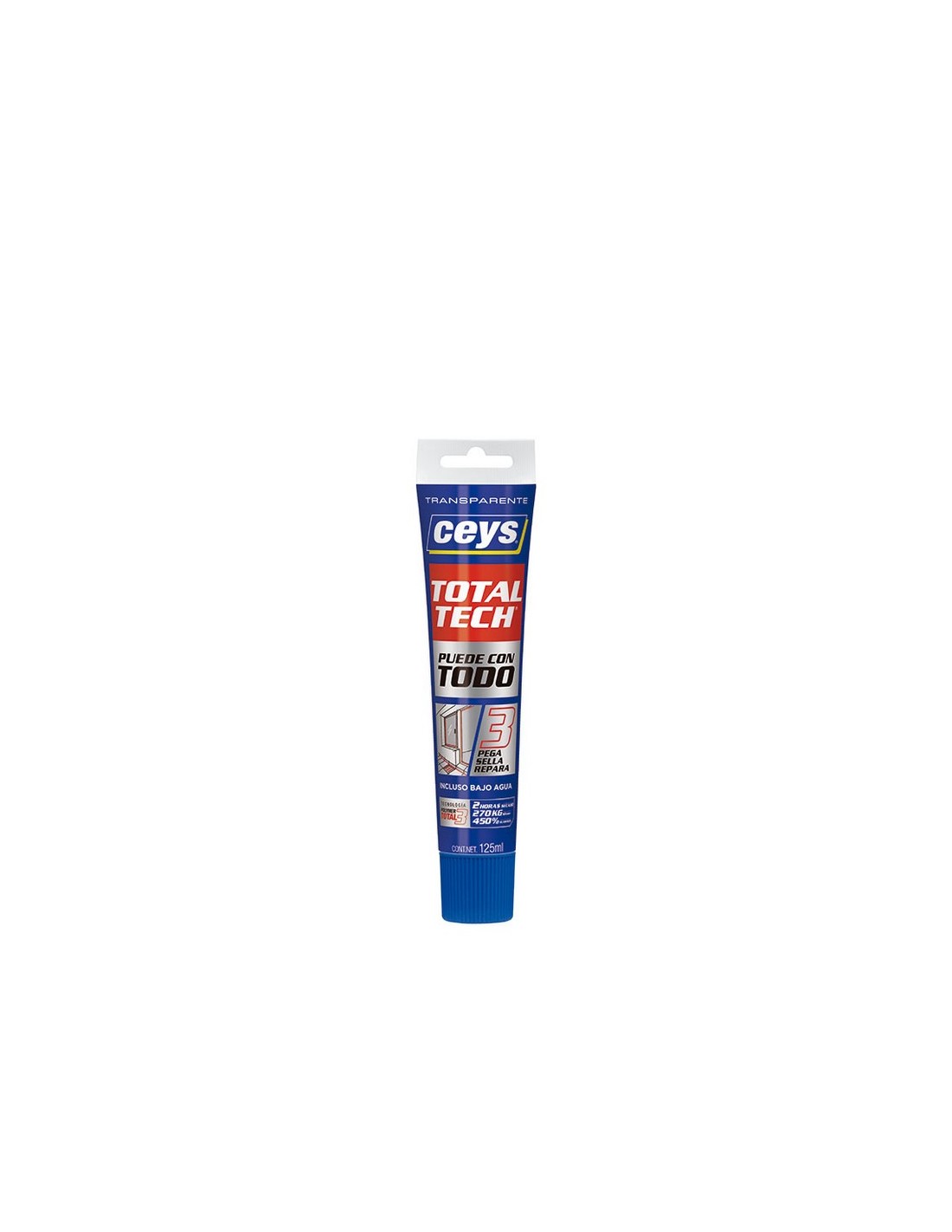 Sellador CEYS Total-Tech Triaction Pega repara y sella. Resiste agua, golpes y temperaturas extremas. Interior-exterior. Translúcido. Tubo 125 gr. Translúcido.