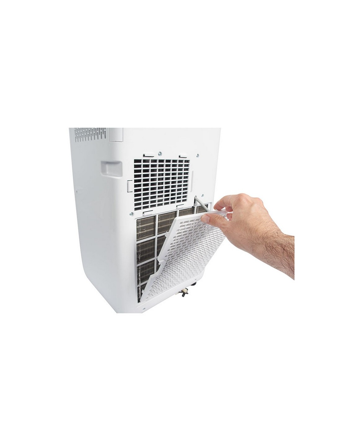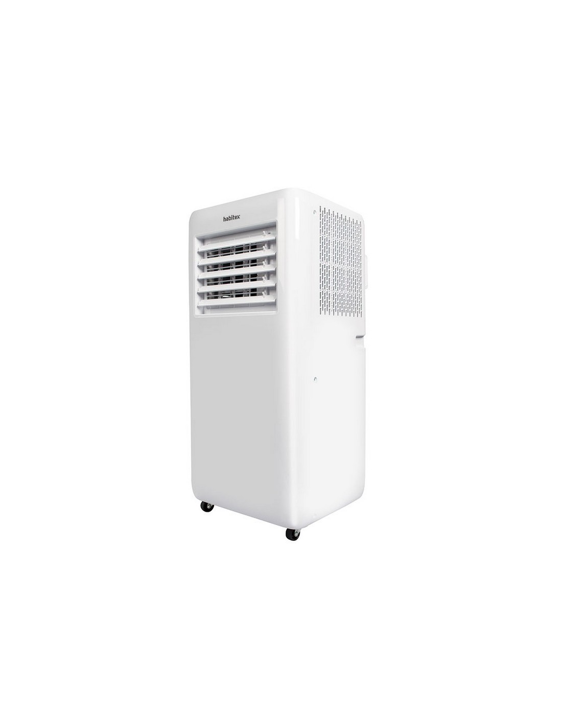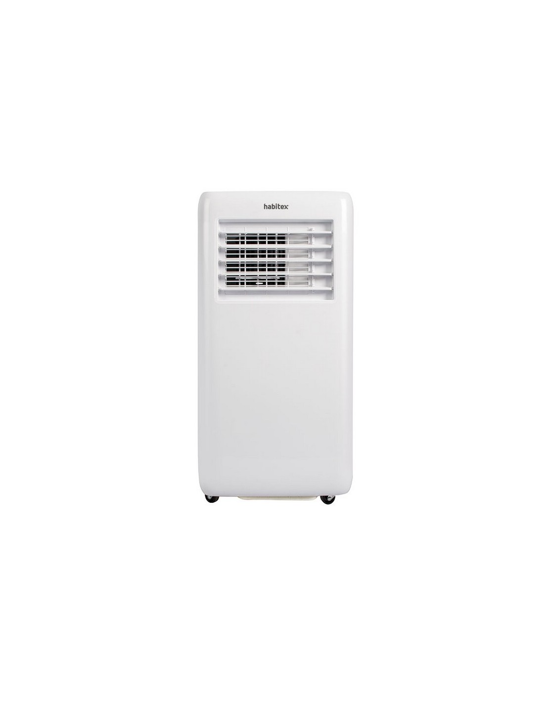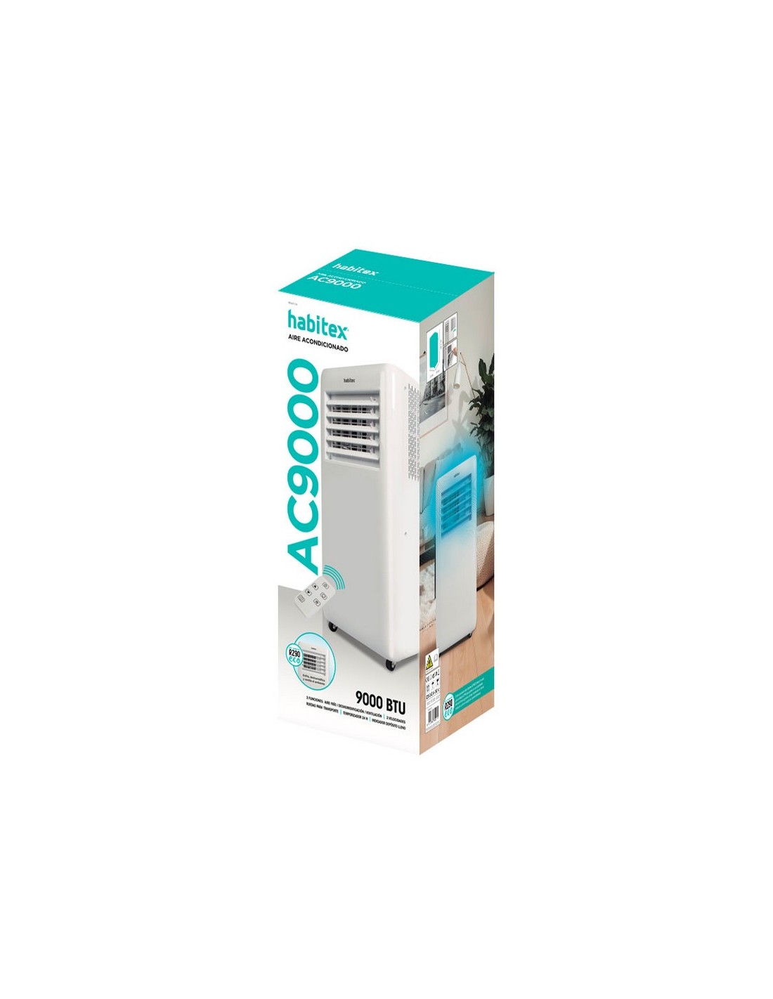 Aire acondicionado portátil HABITEX AC9000 3 funciones: aire frío, deshumidificación y ventilación. 2 velocidades. Oscilación horizontal para una mejor distribución del aire. Temporizador 24 h. Mando a distancia. Indicador depósito lleno. Incluye kit ventana y tubo de extracción ø 15,4 cm y longitud 150 cm. Refrigerante ecológico R290.