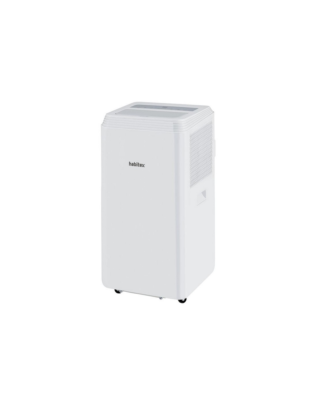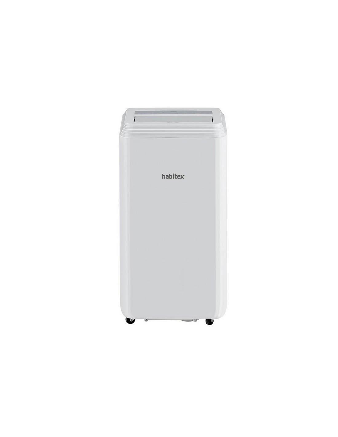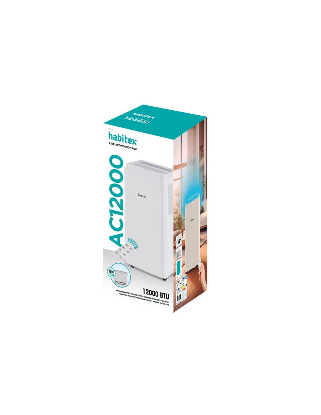 Aire acondicionado portátil HABITEX AC12000 4 funciones: frío, deshumidificación, ventilación y función automática. 3 velocidades. Temporizador 24 horas. Función oscilación. Mando a distancia. Indicador depósito lleno. Incluye kit ventana y tubo de extracción ø 15,4 cm y longitud 150 cm. Ruedas de transporte. Refrigerante ecológico R290.