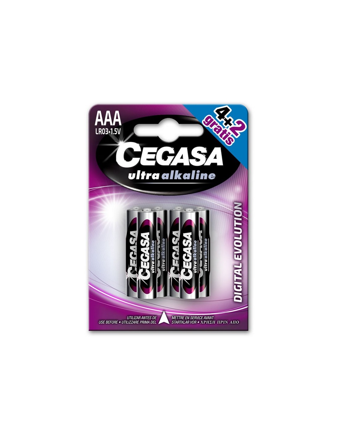 Pila alcalina CEGASA Ultra Alkaline AAA LR03 1,5 V. Se sirve en una caja con 12 blíster. Cada Blíster contiene 4+2 unidades.