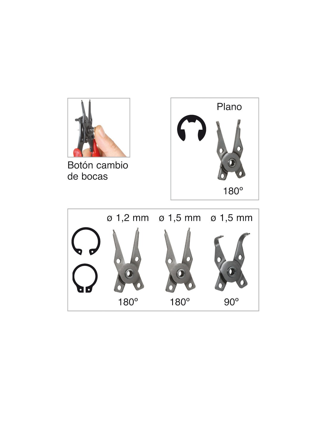 Alicate arandelas universal RATIO 6556 Juego 4 bocas intercambiables para utilizar con arandelas interiores o exteriores 10-50 mm. Composición: \r\n1 Boca recta 180º. Punta arandela ø 1,2 mm. \r\n1 Boca recta 180º. Punta arandela ø 1,5 mm. \r\n1 Boca curva 90º. Punta arandela ø 1,5 mm. \r\n1 Boca recta para anillos retención.