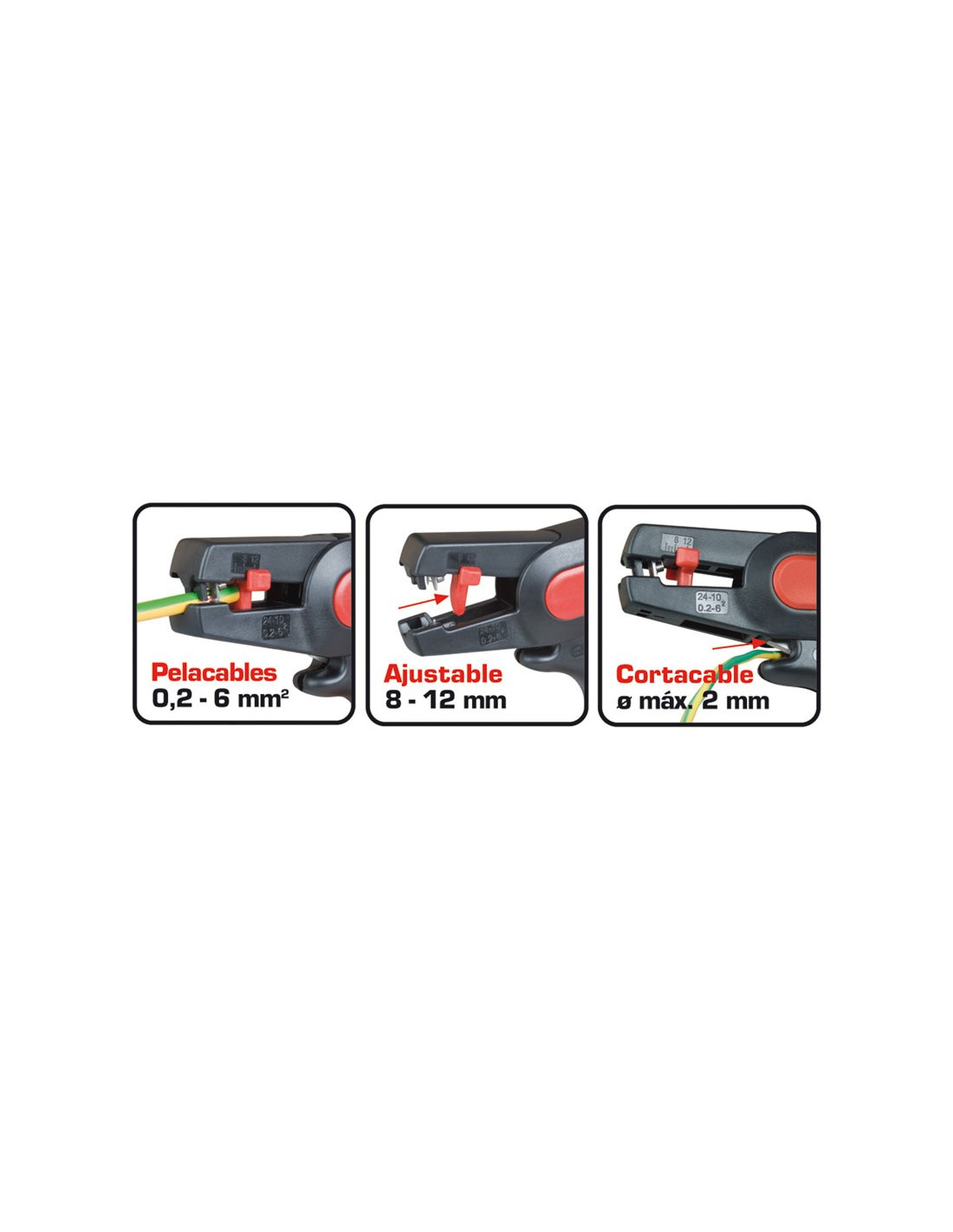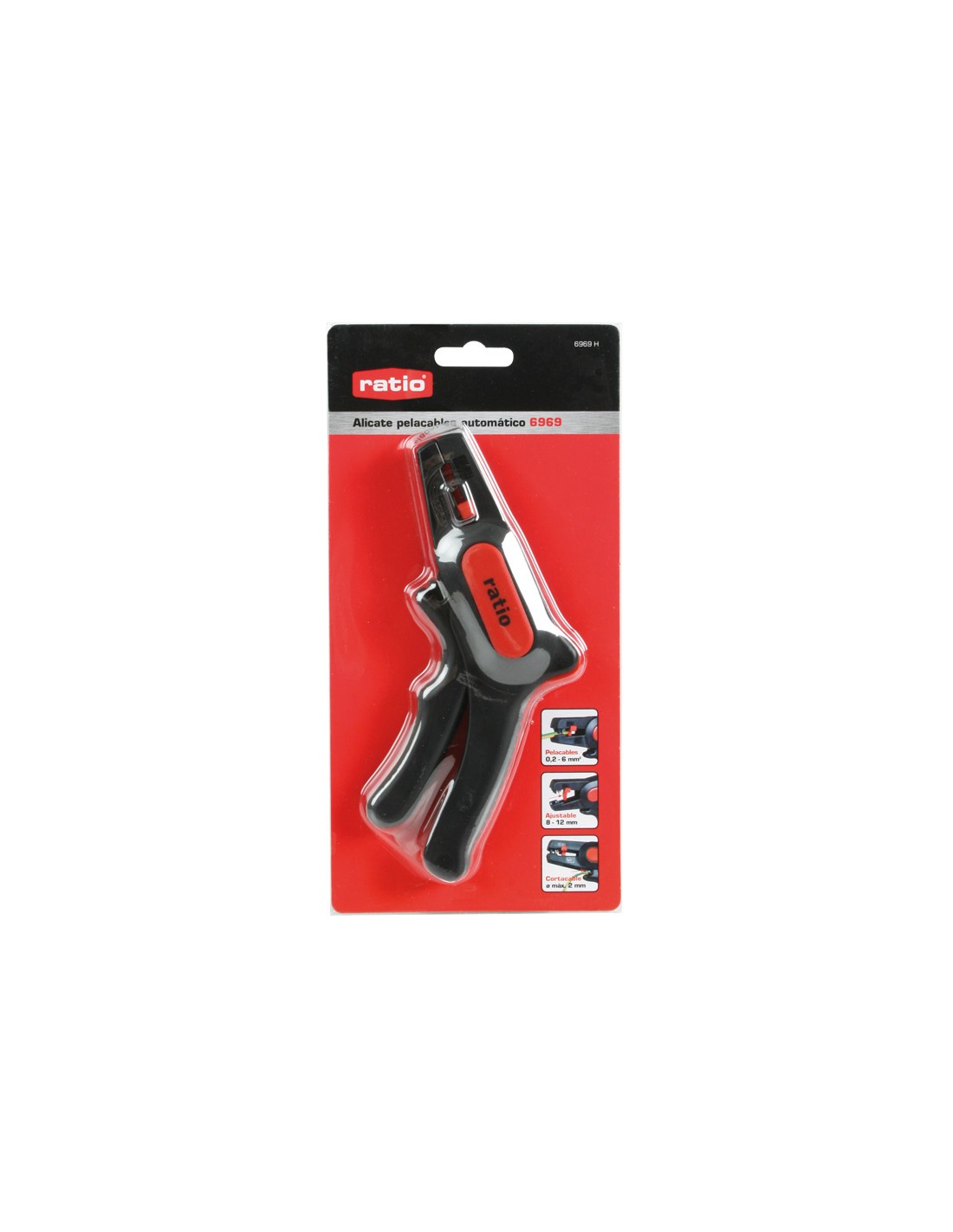 Alicate pelacables automático RATIO 6969 Cuchillas acero SK5. Cuerpo fibra de vidrio reforzada. Cables 0,2-6 mm² (10-24 AWG) y selector de longitud 8-12 mm. Cortacables ø máx. 2 mm.