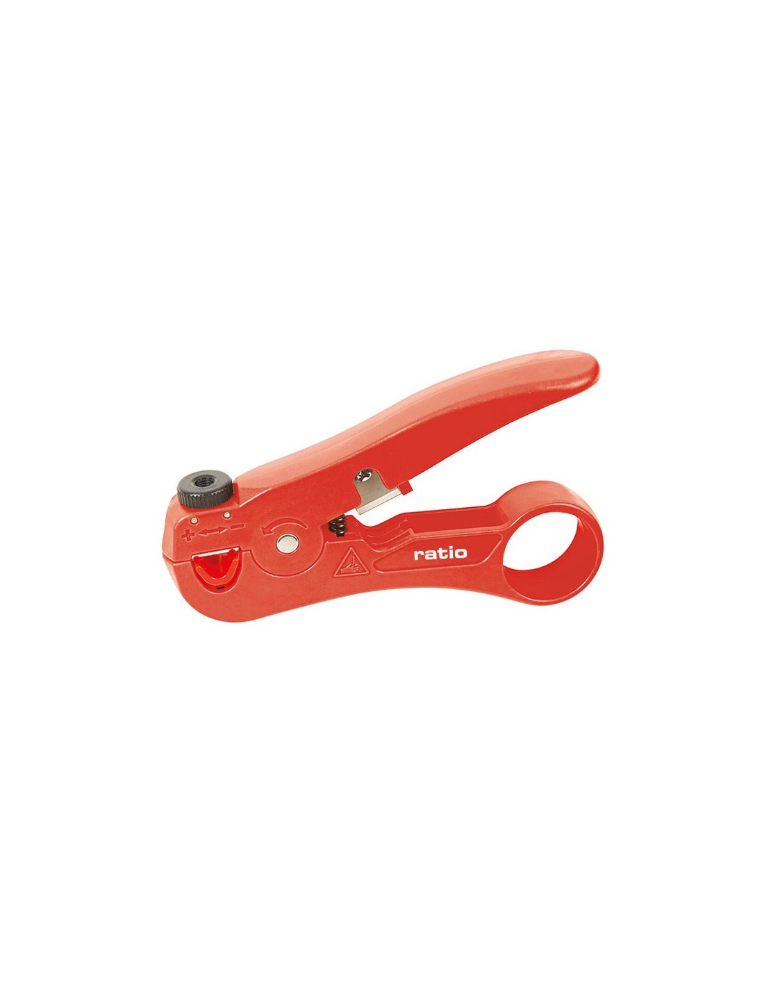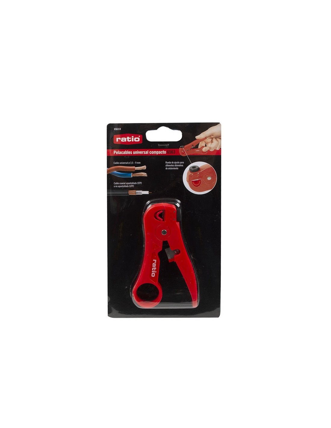Pelacables compacto RATIO 6563 Fácil y rápido de usar. Para cables coaxiales apantallados (STP) y no apantallados (UTP), cable universal de ø 3,5 - 9 mm. Ajustable a diferentes ø de aislamiento. Dispone de cortacables.. 110 mm.