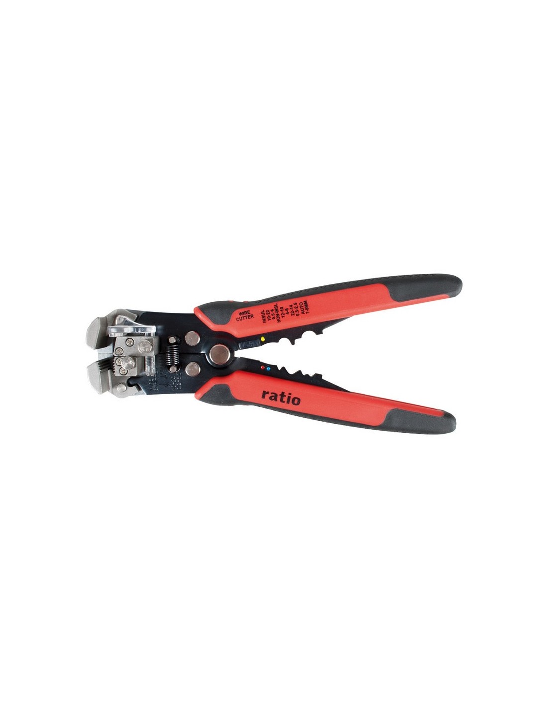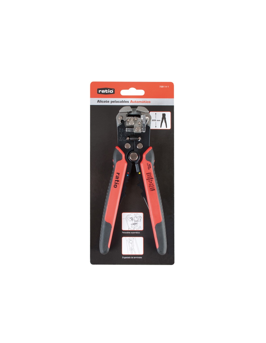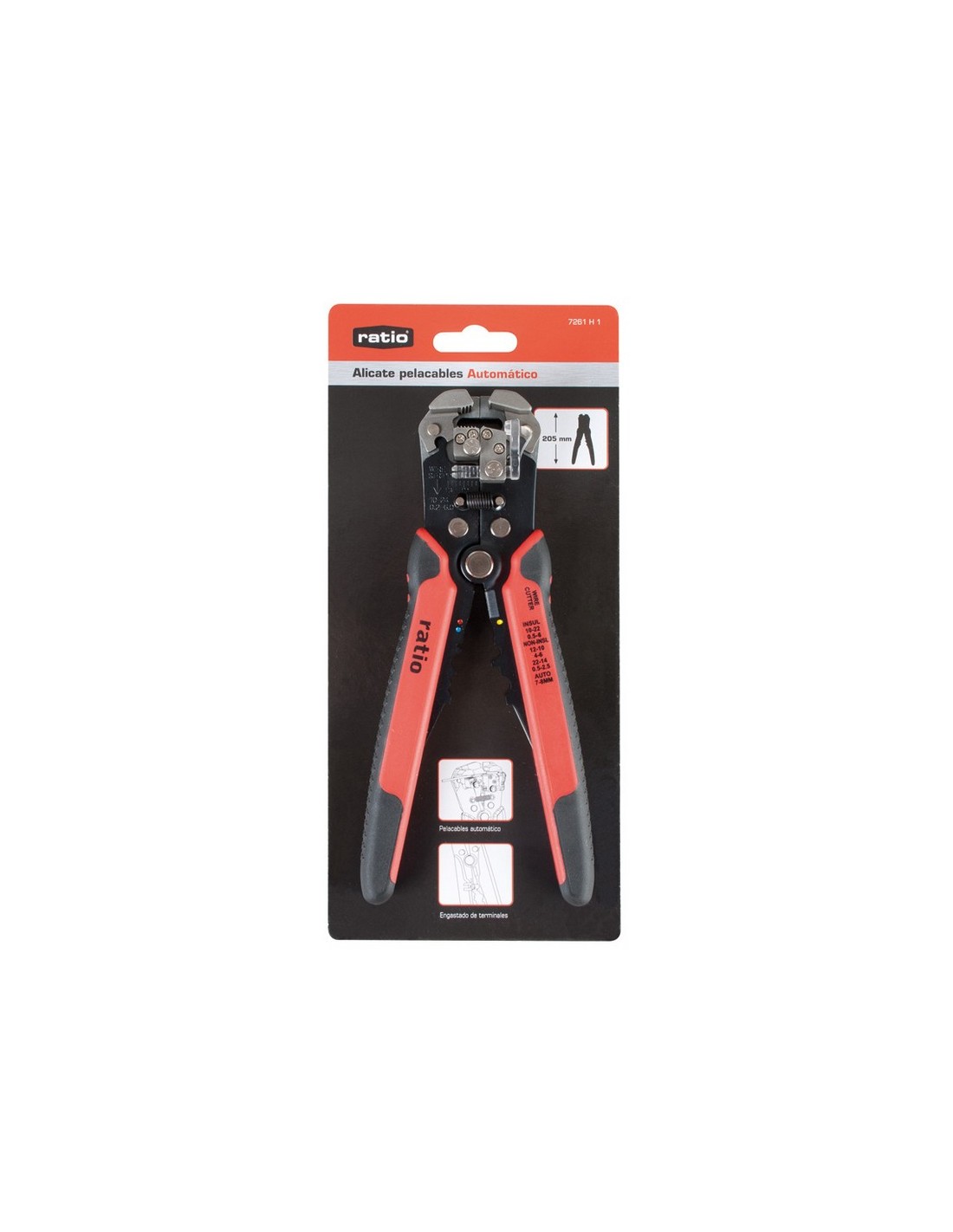Alicate pelacables automático RATIO 7261 Calidad profesional. Mordazas acero con tratamiento térmico HRc 52º-57º. Cuerpo acero SS41 acabado óxido negro, dureza HRc 55º-60º. Pelado de todo tipo de cable 0,13-6 mm² (8-26 AWG). Microajuste de longitud pelado del cable. Engastado de terminales. Mango bimaterial antideslizante. 205 mm.