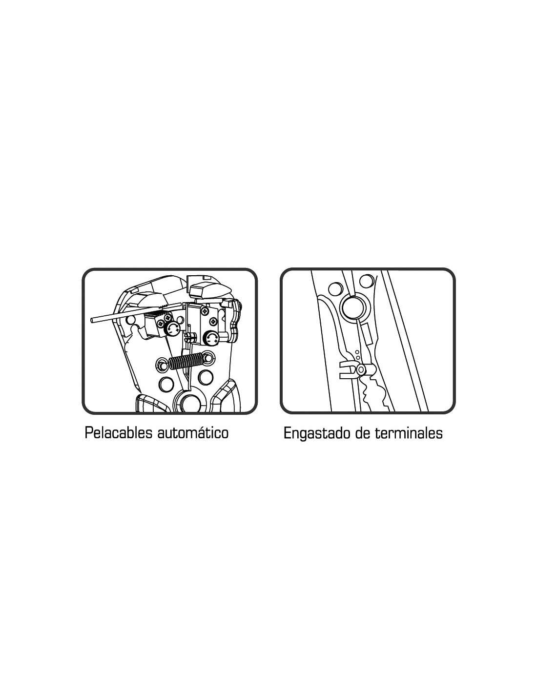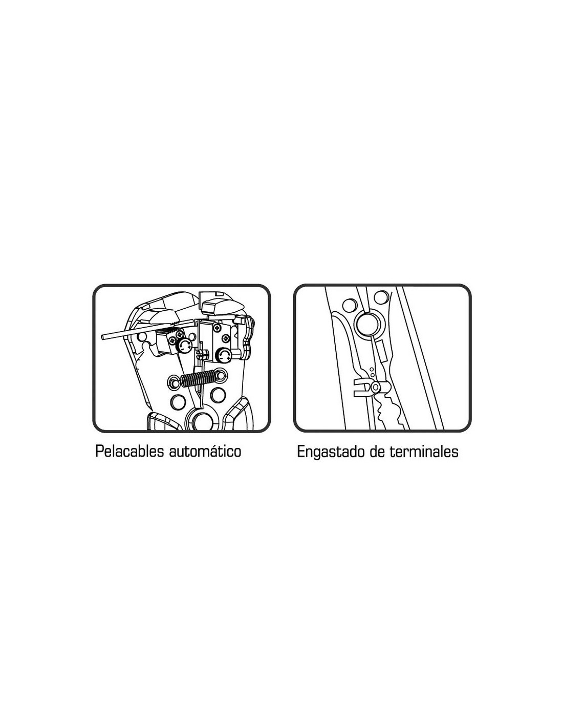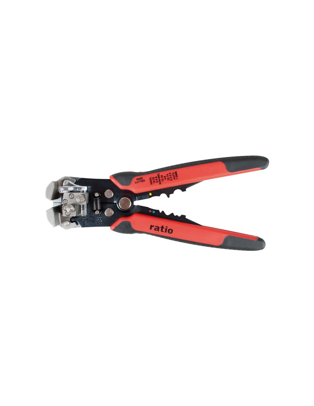 Alicate pelacables automático RATIO 7261 Calidad profesional. Mordazas acero con tratamiento térmico HRc 52º-57º. Cuerpo acero SS41 acabado óxido negro, dureza HRc 55º-60º. Pelado de todo tipo de cable 0,13-6 mm² (8-26 AWG). Microajuste de longitud pelado del cable. Engastado de terminales. Mango bimaterial antideslizante. 205 mm.